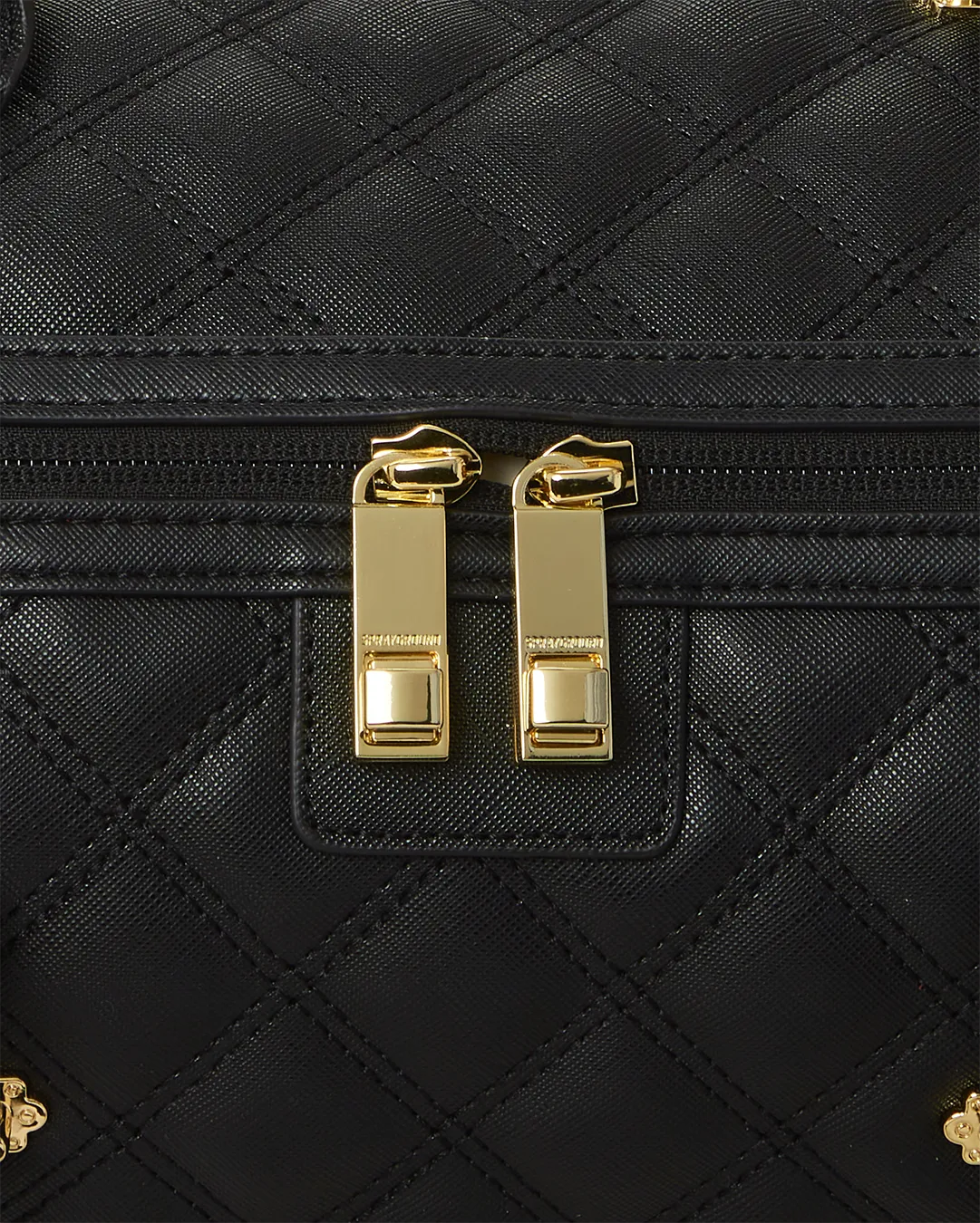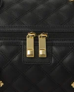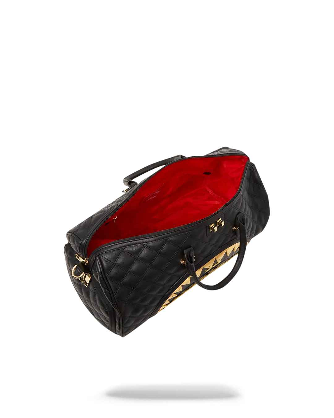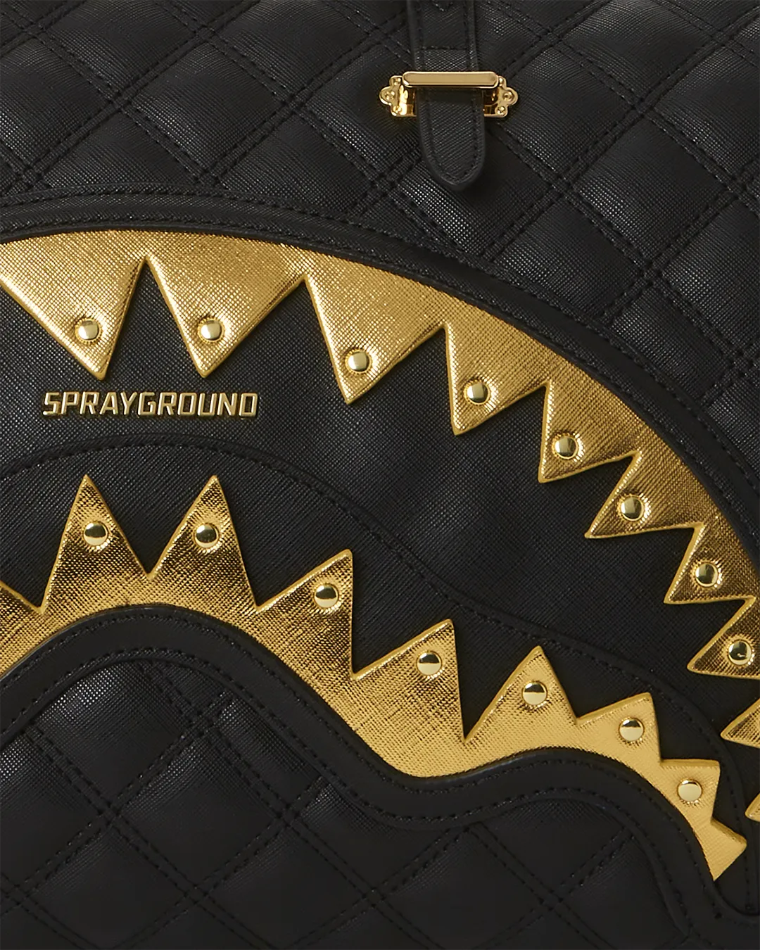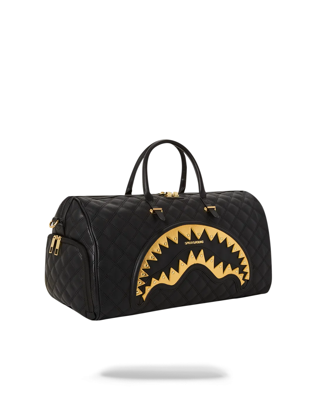 Sophisticated quilted faux leather collection. Accented with metallic gold shark mouths and nail head hardware details.