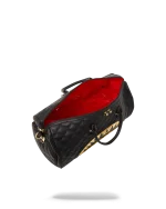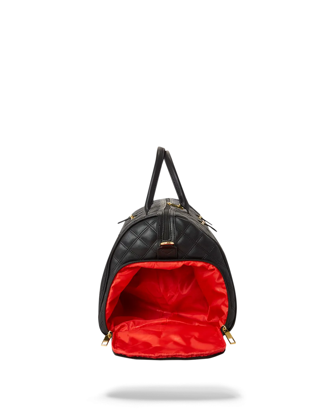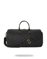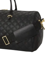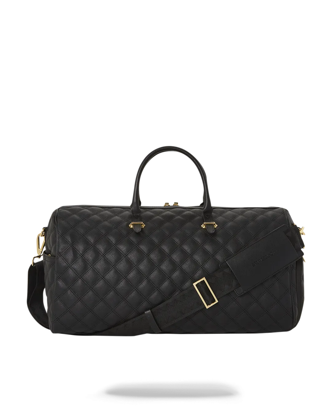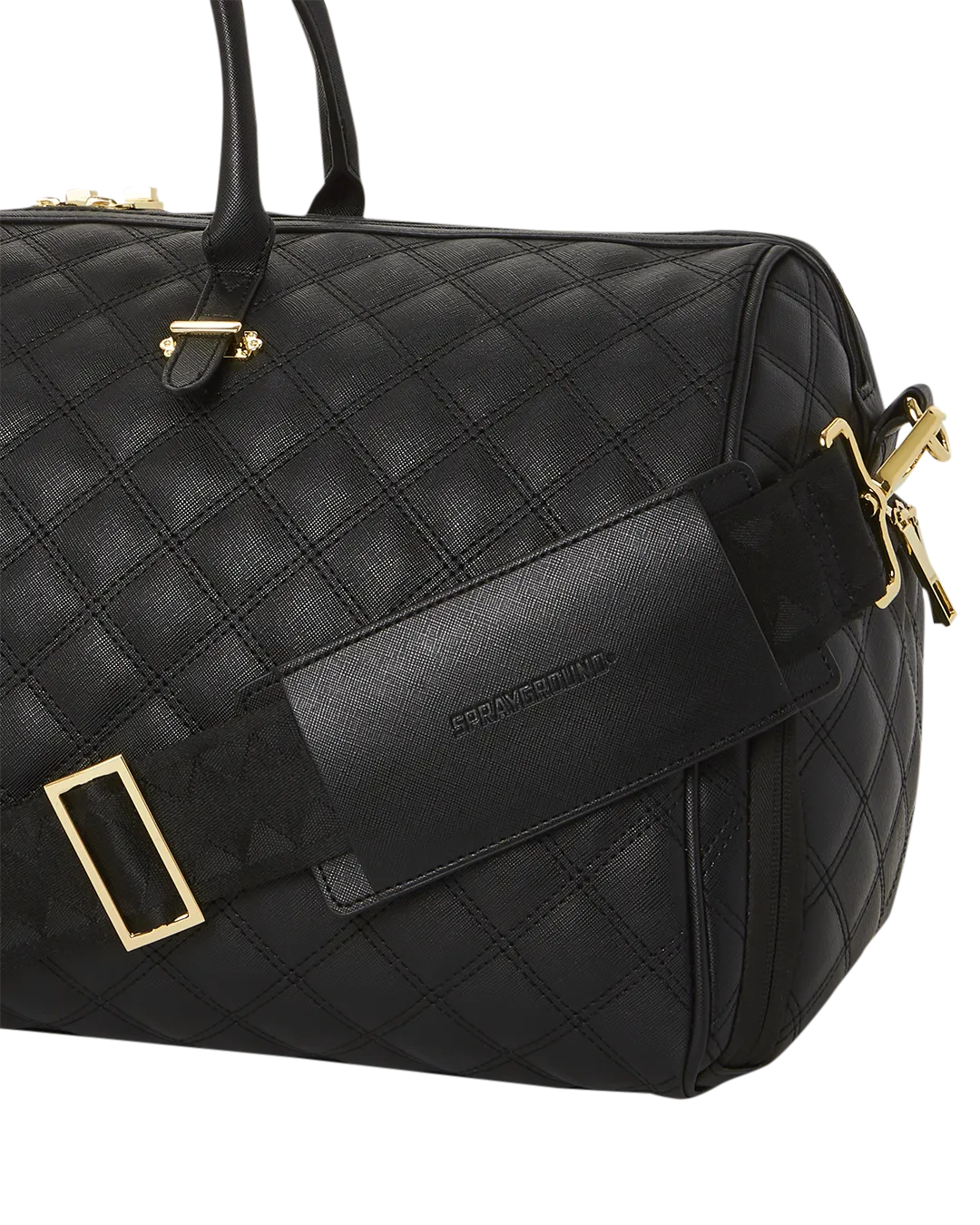 Sophisticated quilted faux leather collection. Accented with metallic gold shark mouths and nail head hardware details.