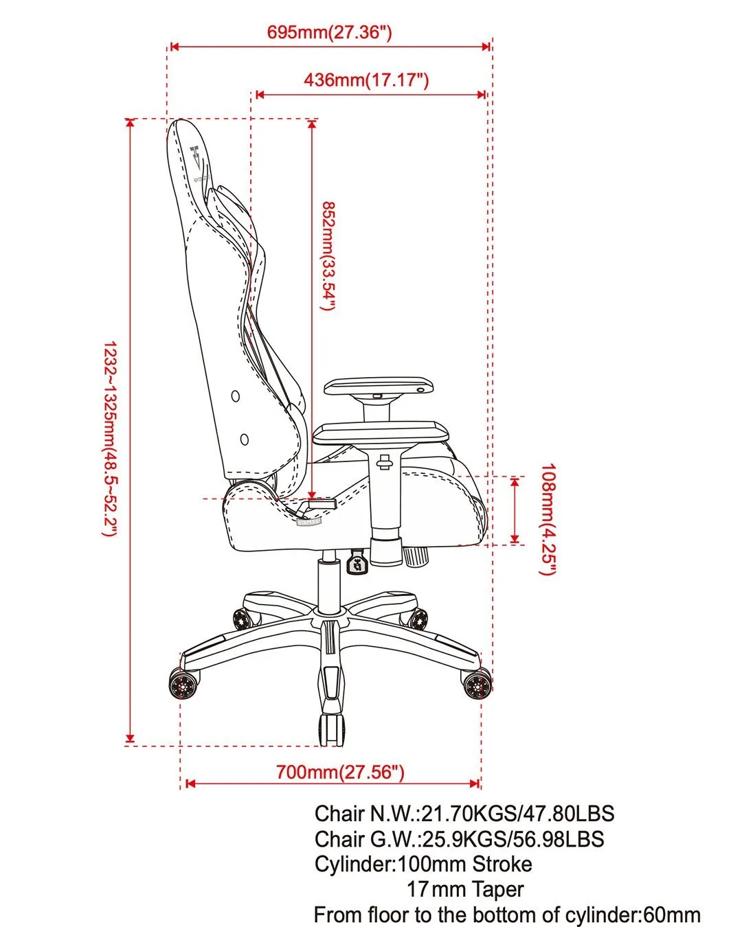 - Includes 4D adjustable armrests for up/down, side/side, forward/back, and swivel left/right adjustment.