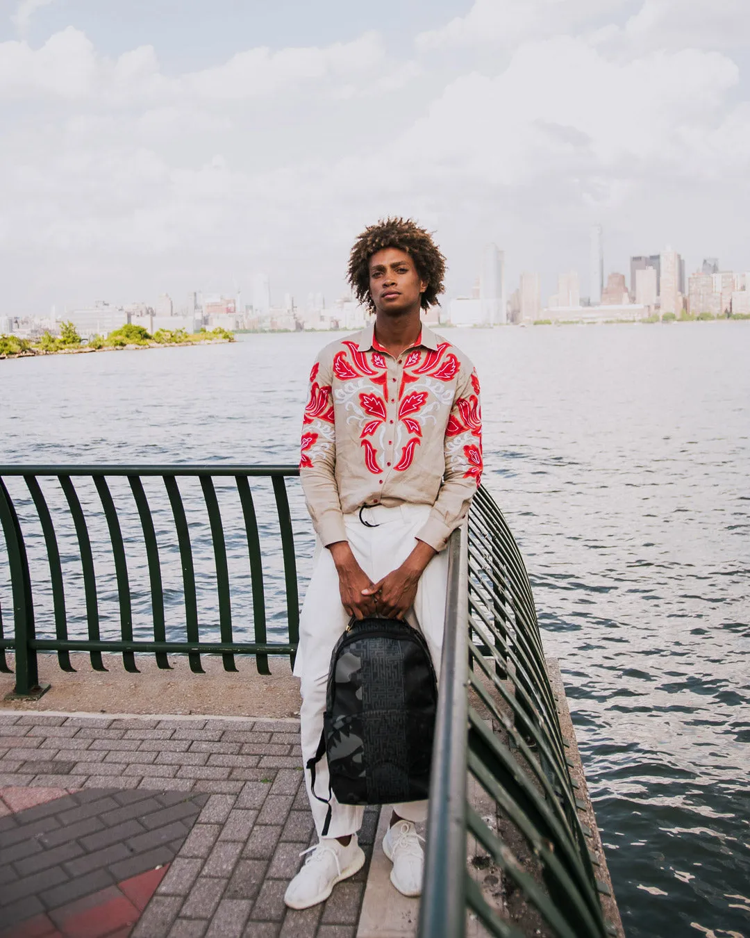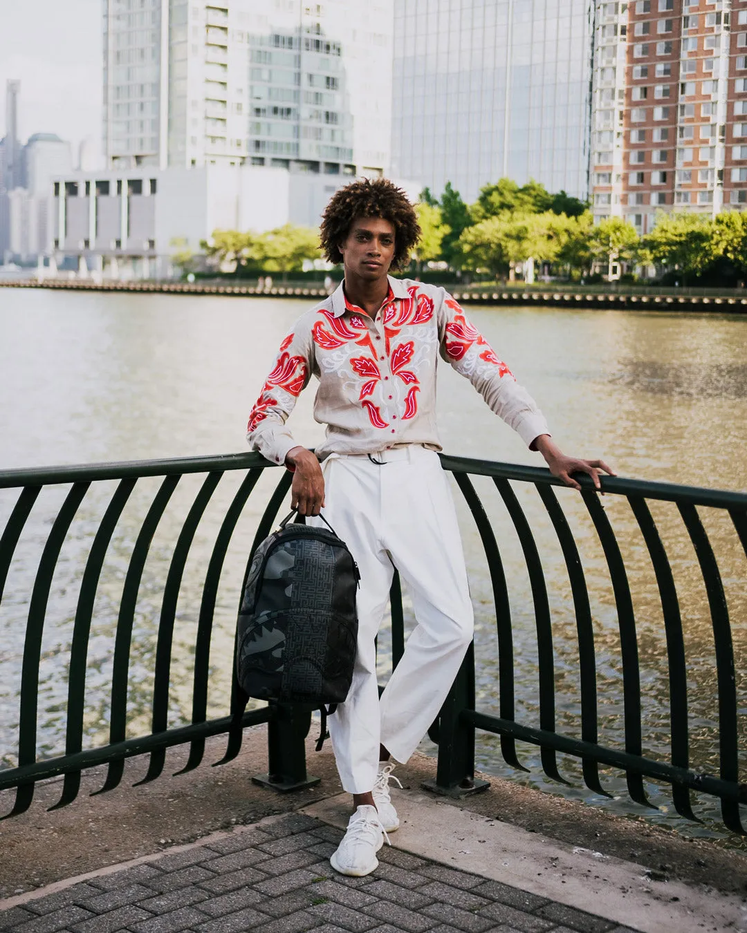 Dimensions: 18″ x 6″ x 11.5″ ? Front zipper pocket ? Side pockets ? Zippered Stash pocket ? Separate velour sunglass compartment ? Ergonomic mesh back padding ? Adjustable Straps for custom sizing ? Gold zippers with metal hardware ? Metal “Sprayground Authentic” badge ? Slide through back sleeve connects to carry-on luggage to free your hands
