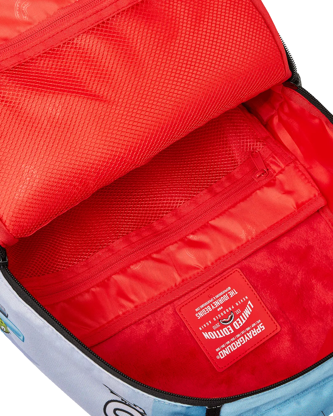 Dimensions: 18″ x 6″ x 11.5″ ? Front zipper pocket ? Side pockets ? Zippered Stash pocket ? Separate velour sunglass compartment ? Ergonomic mesh back padding ? Adjustable Straps for custom sizing ? Gold zippers with metal hardware ? Metal “Sprayground Authentic” badge ? Slide through back sleeve connects to carry-on luggage to free your hands