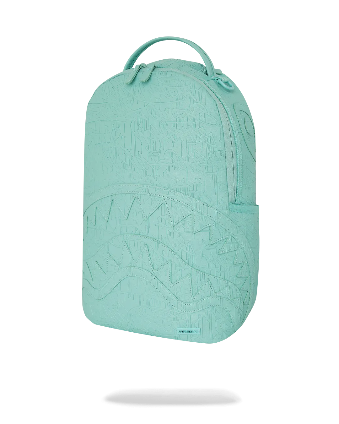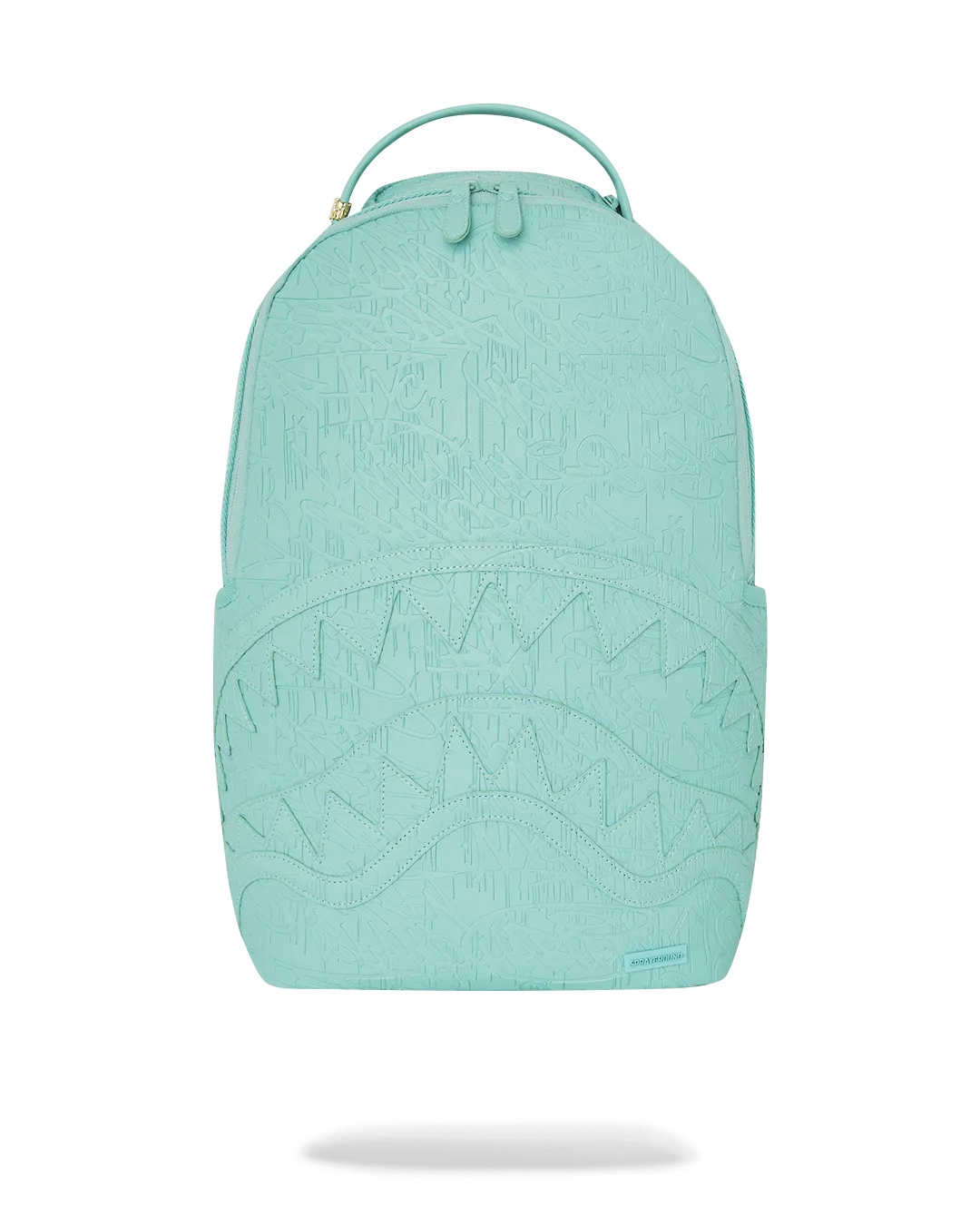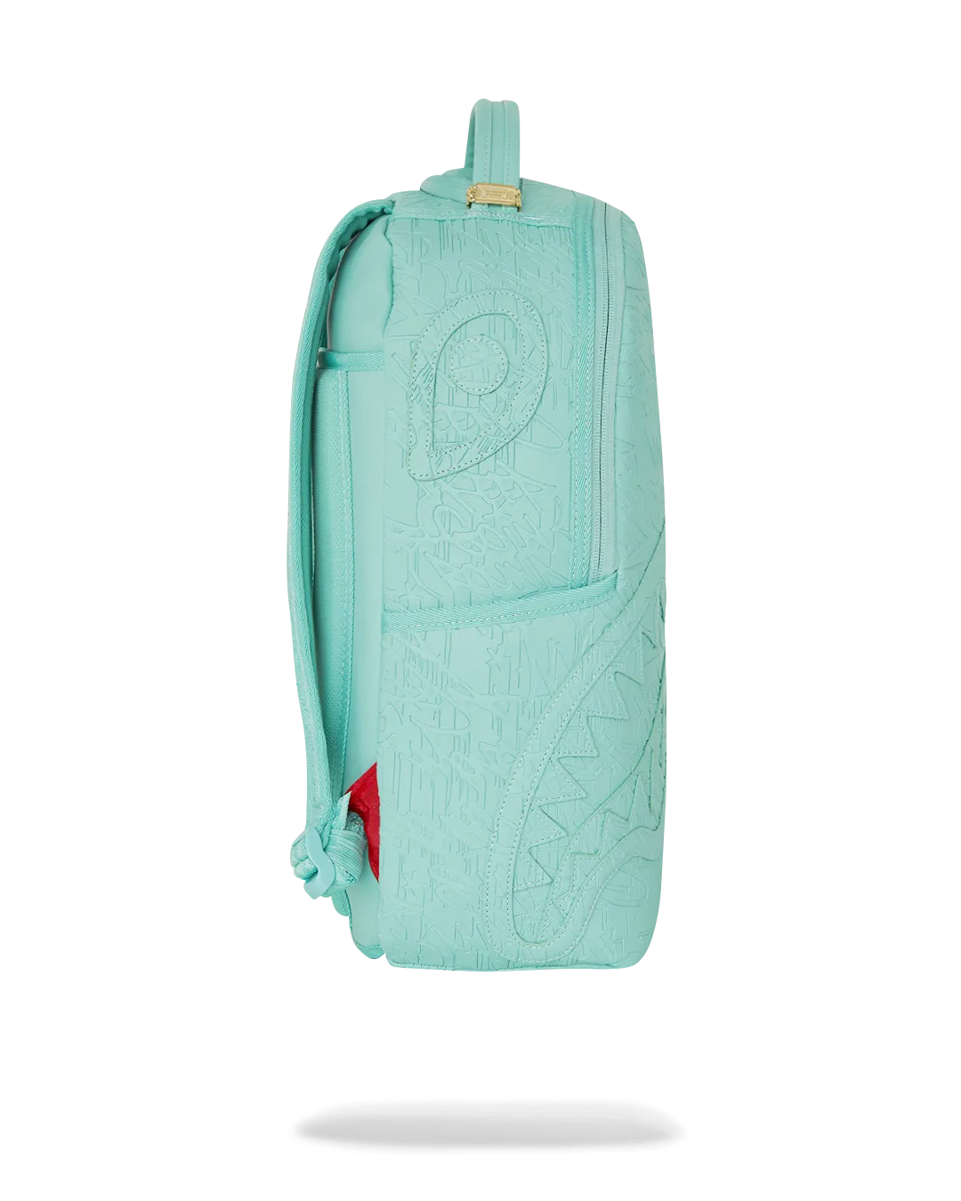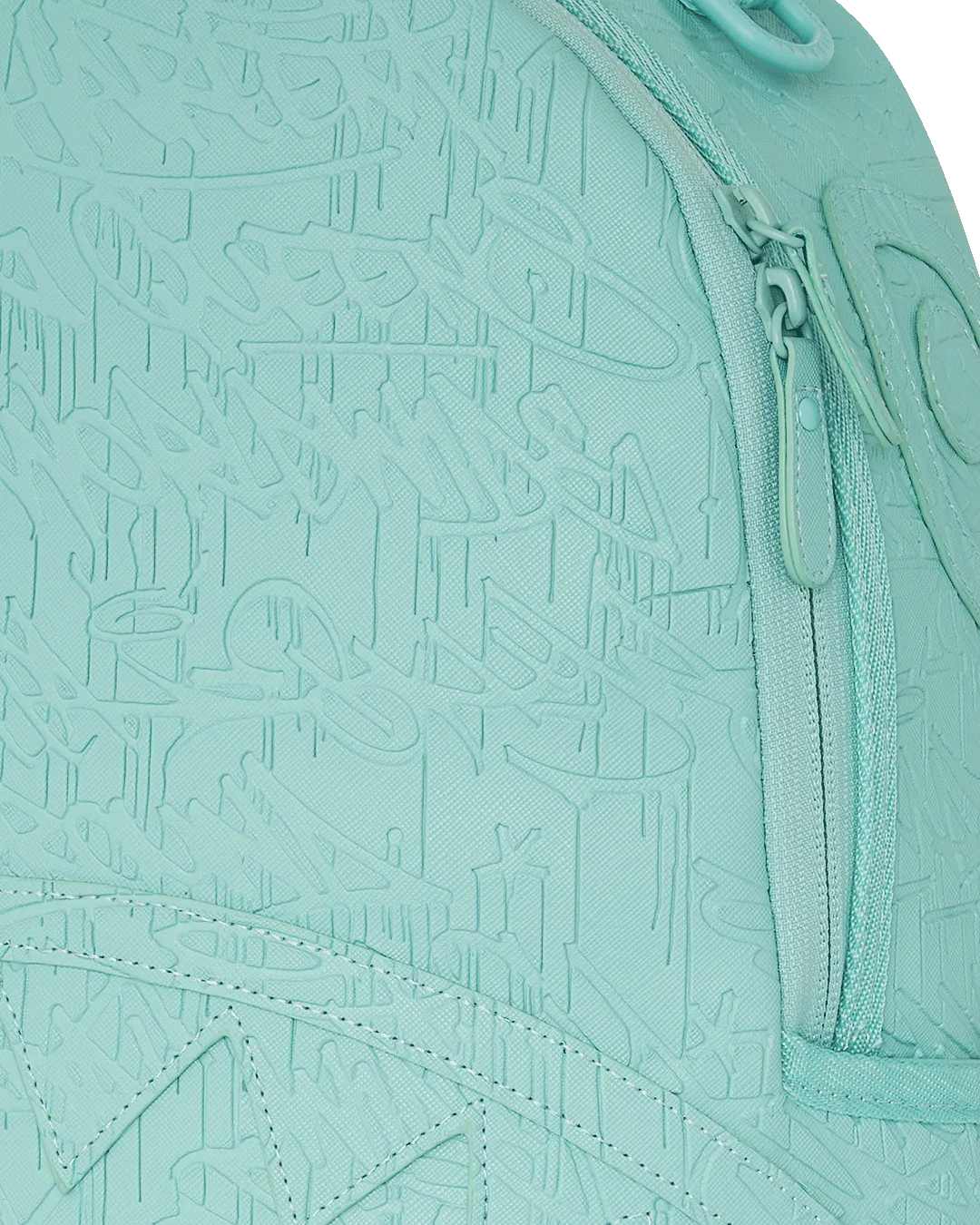 Aqua backpack with graffiti embossing and cut and sew sharkmouth.