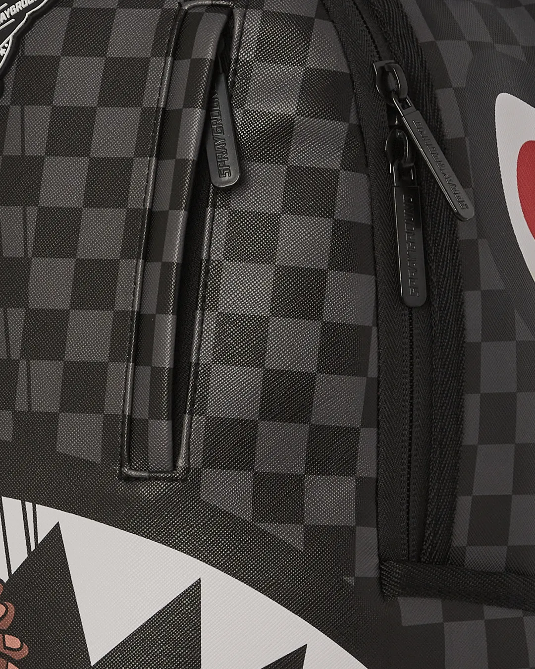 Dimensions: 18″ x 6″ x 11.5″ ? Front zipper pocket ? Side pockets ? Zippered Stash pocket ? Separate velour sunglass compartment ? Ergonomic mesh back padding ? Adjustable Straps for custom sizing ? Gold zippers with metal hardware ? Metal “Sprayground Authentic” badge ? Slide through back sleeve connects to carry-on luggage to free your hands