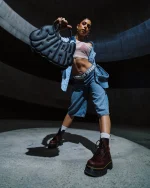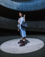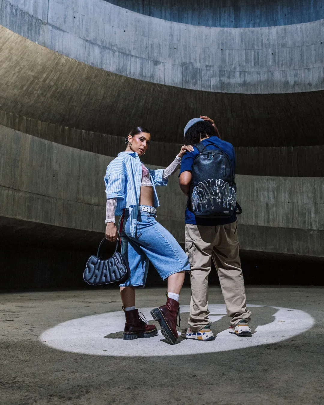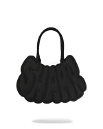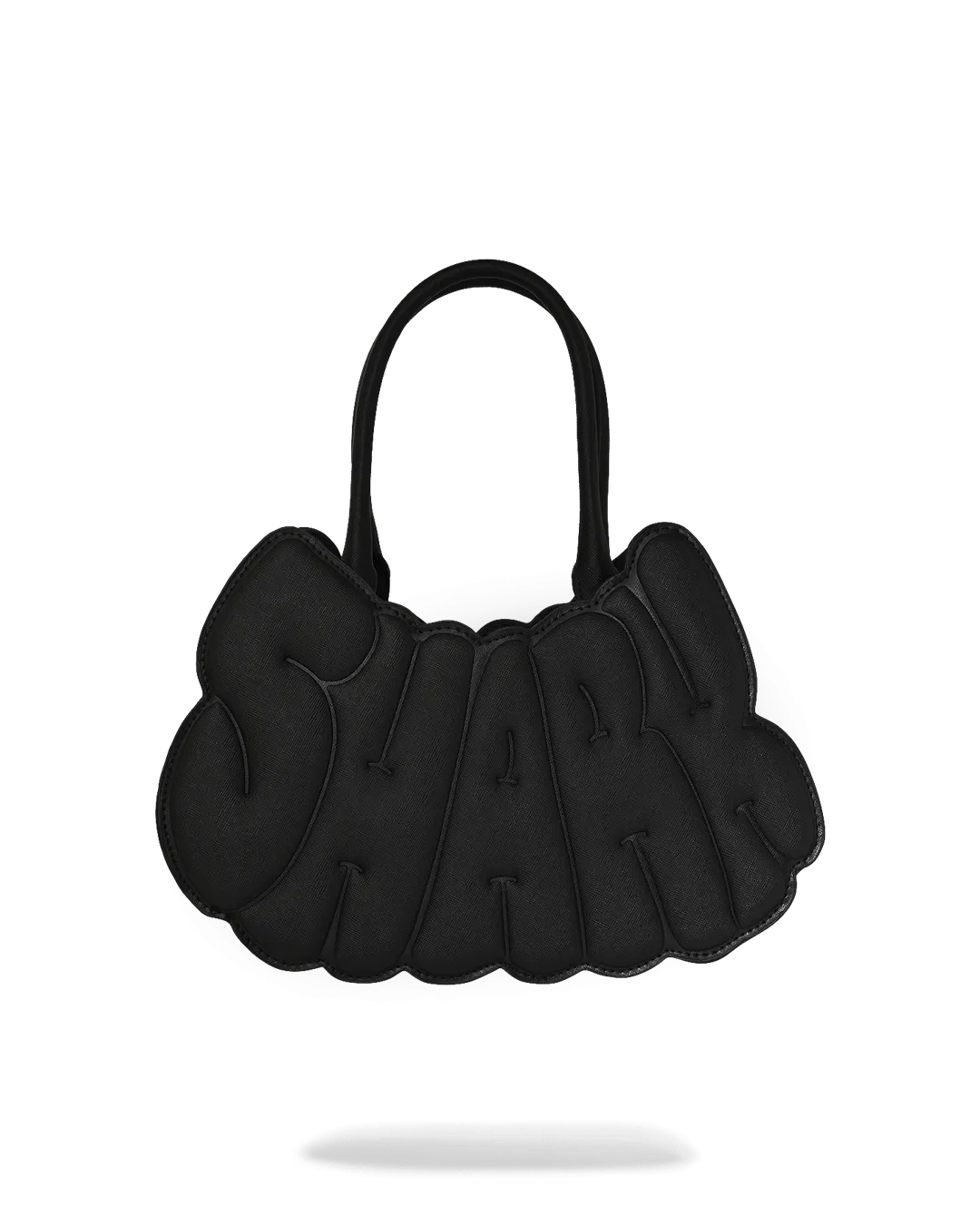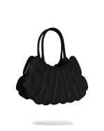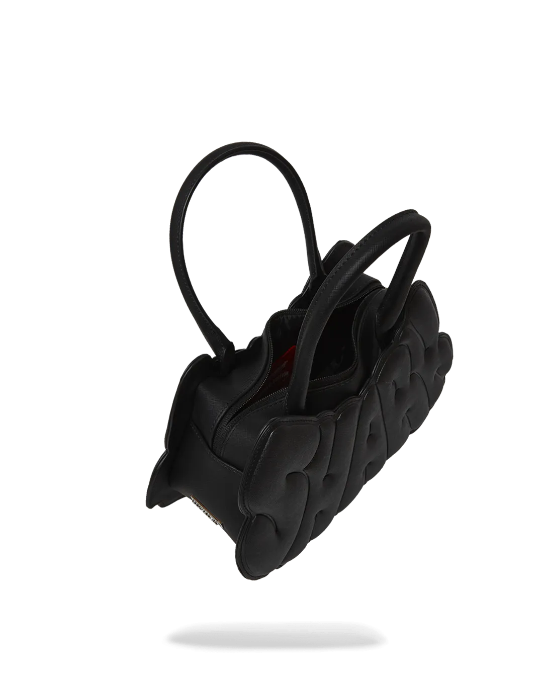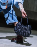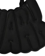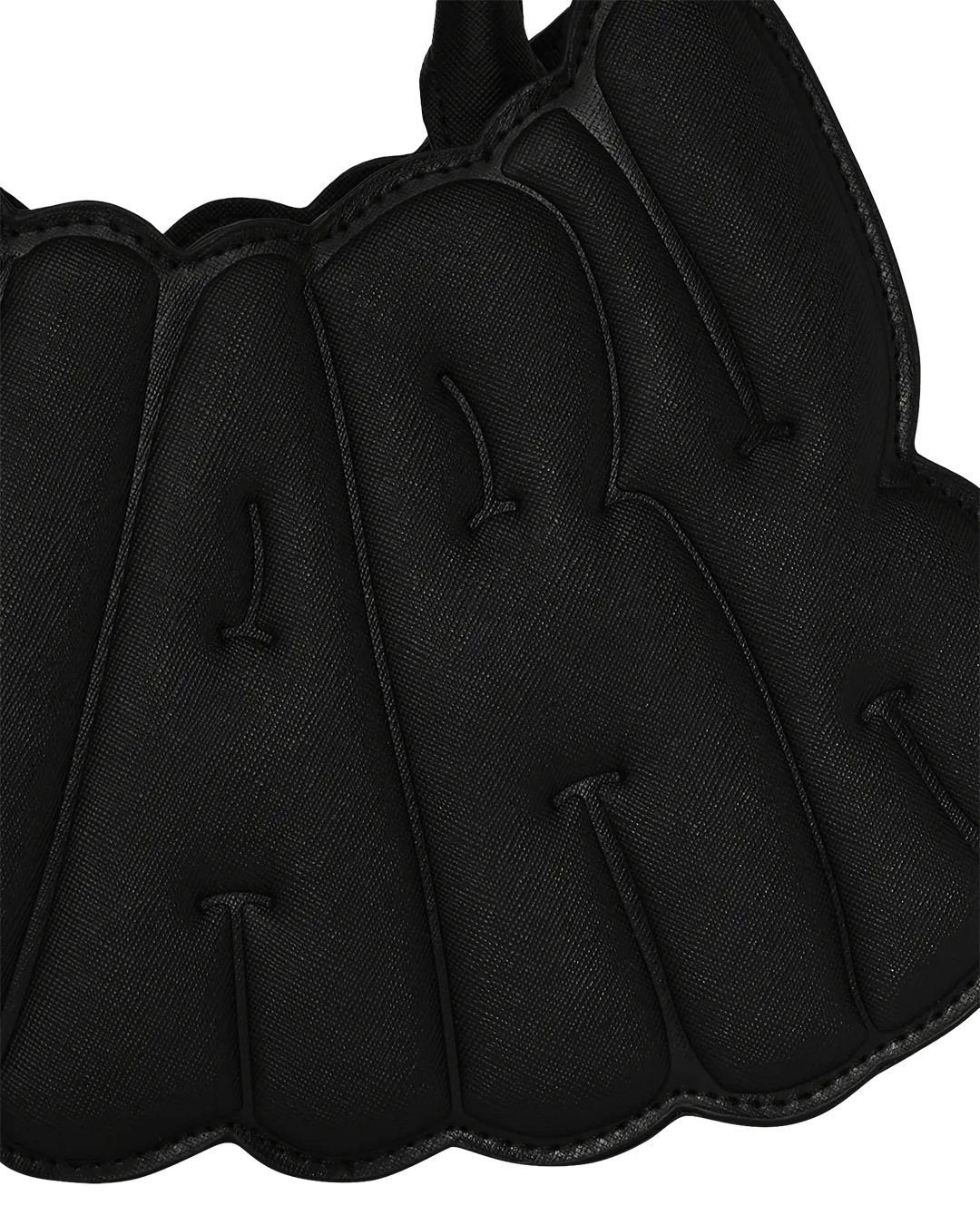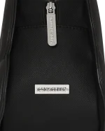 Black saffiano PVC offers a textured, scratch-resistant surface with a matte finish. The vegan leather handle is soft yet sturdy, designed for comfort. Gunmetal chains and studs add a cool, industrial shine, perfectly contrasting the tactile saffiano texture?