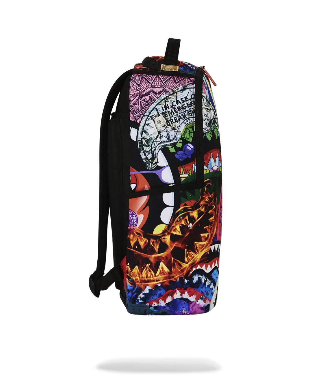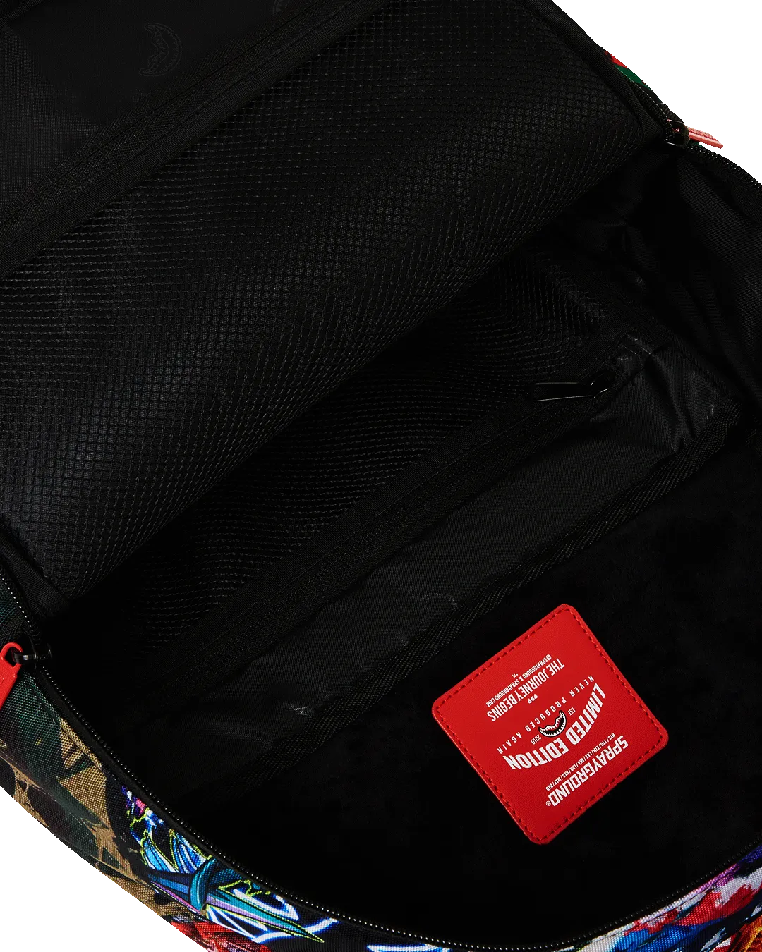 Dimensions: 18″ x 6″ x 11.5″ ? Front zipper pocket ? Side pockets ? Zippered Stash pocket ? Separate velour sunglass compartment ? Ergonomic mesh back padding ? Adjustable Straps for custom sizing ? Gold zippers with metal hardware ? Metal “Sprayground Authentic” badge ? Slide through back sleeve connects to carry-on luggage to free your hands