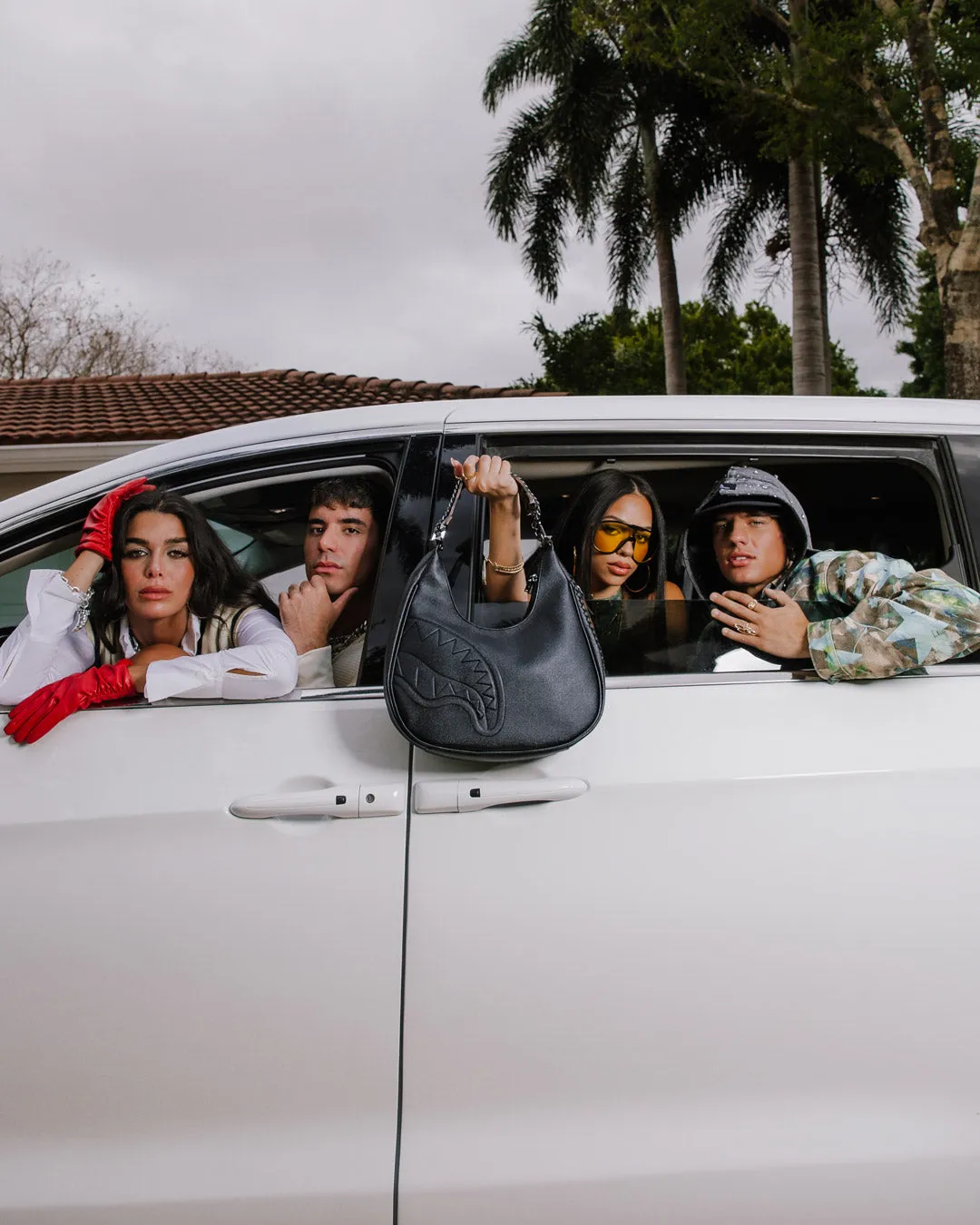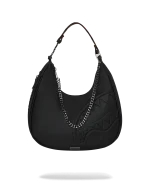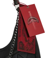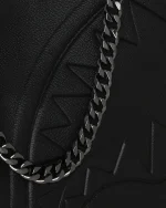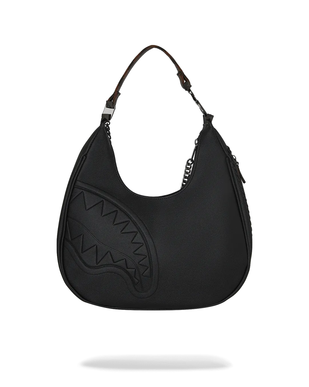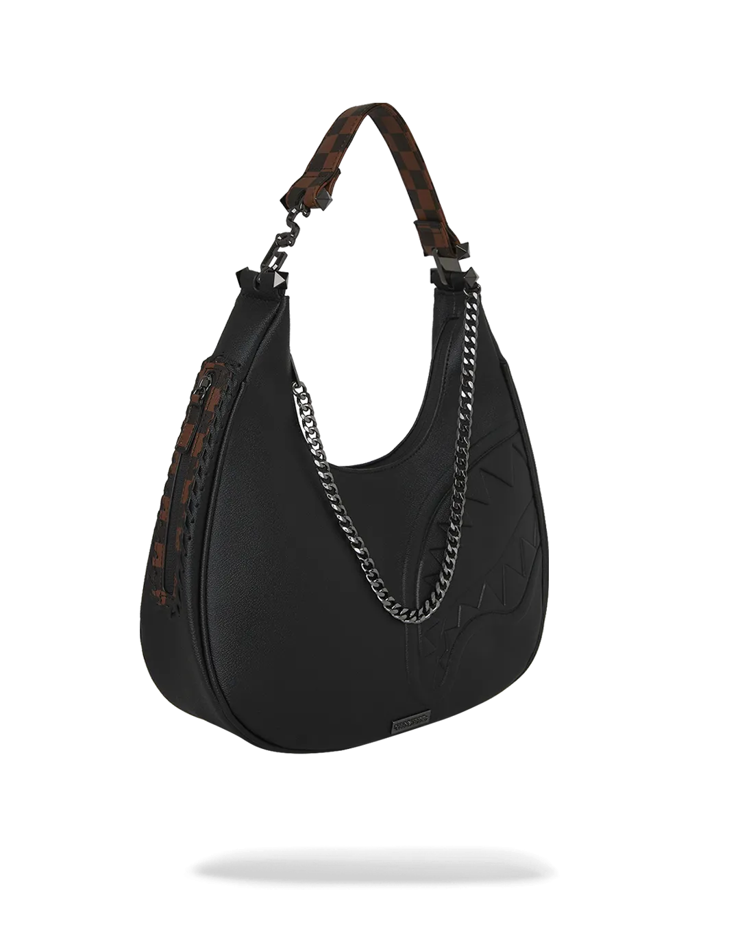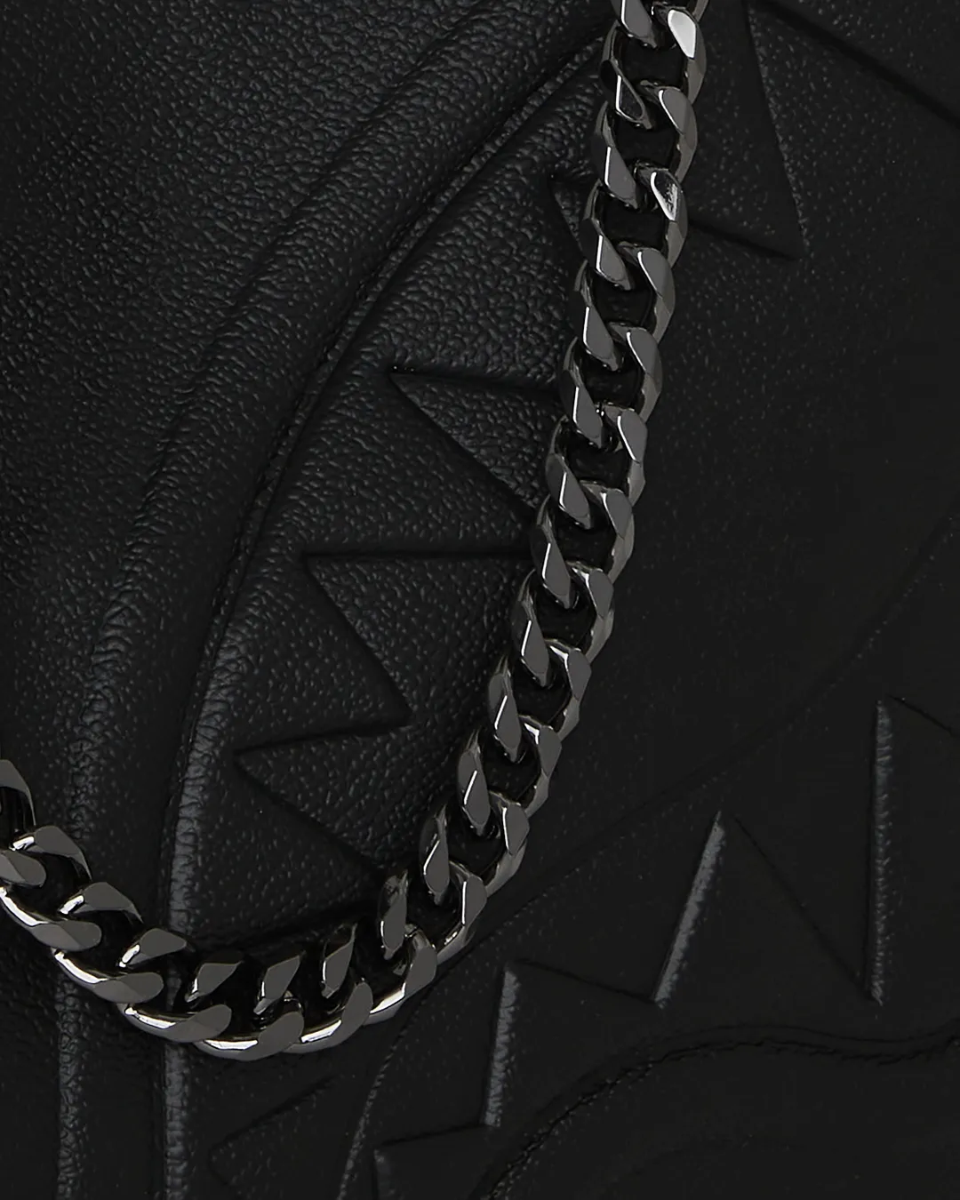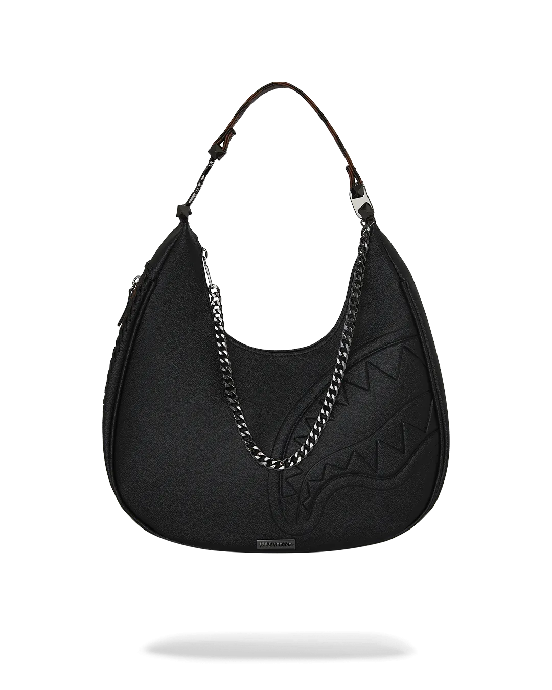 Embossed sharkmouth handbag, gunmetal chain attached to the zipper, studs, and SG handle detail plus one interior pocket.