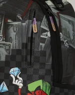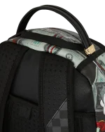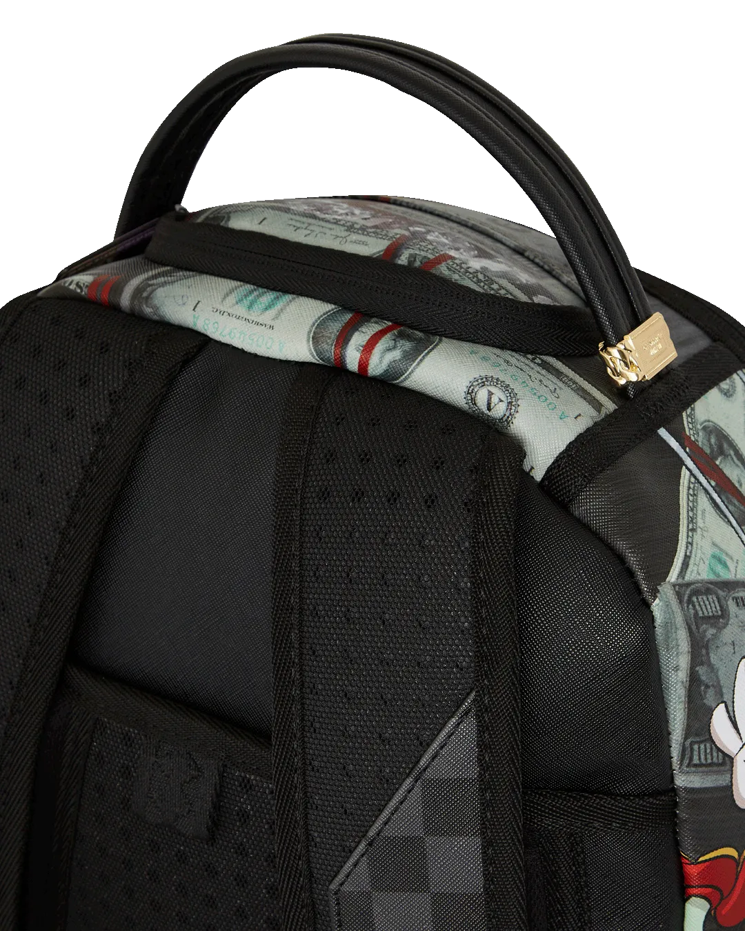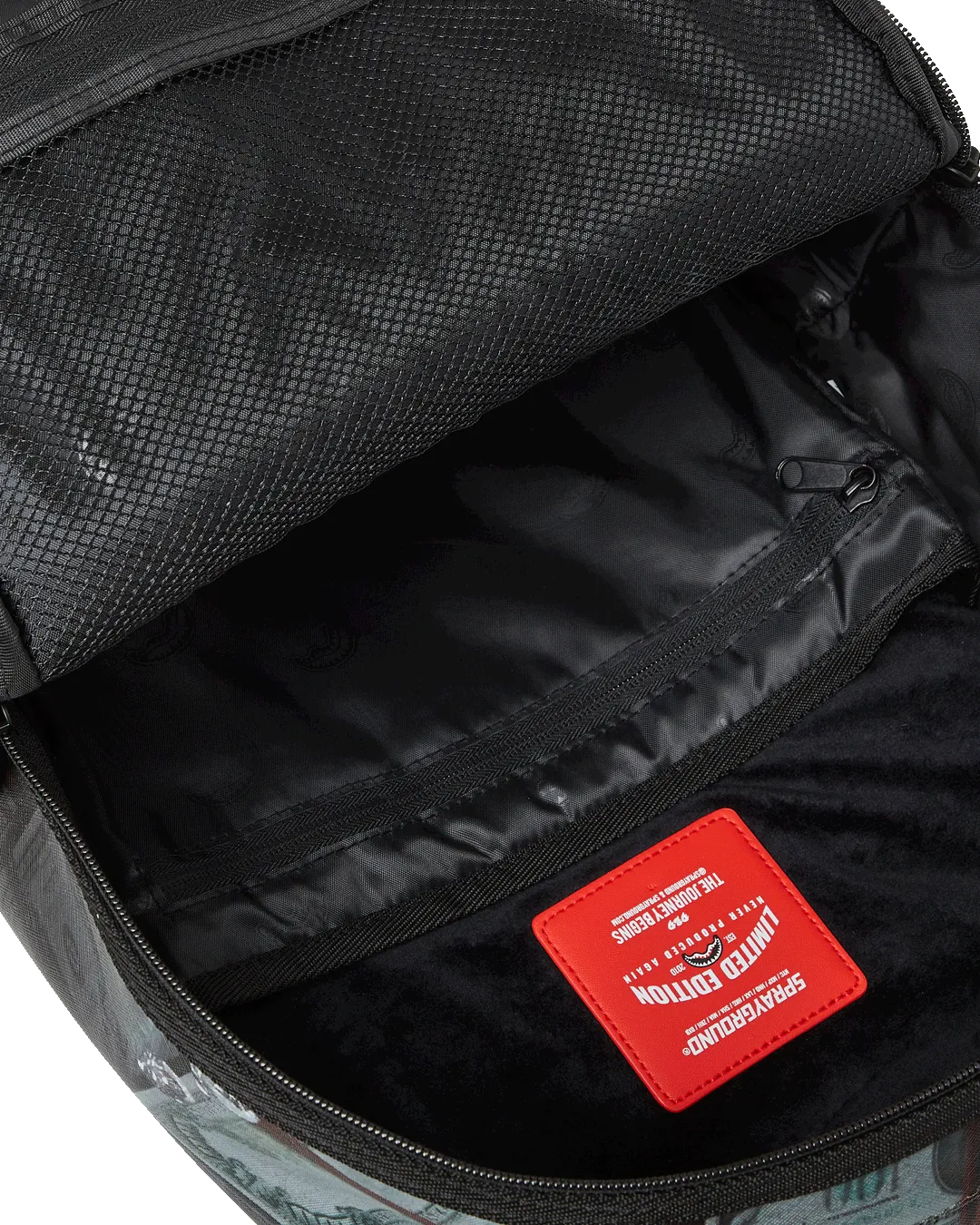 Dimensions: 18″ x 6″ x 11.5″ ? Front zipper pocket ? Side pockets ? Zippered Stash pocket ? Separate velour sunglass compartment ? Ergonomic mesh back padding ? Adjustable Straps for custom sizing ? Gold zippers with metal hardware ? Metal “Sprayground Authentic” badge ? Slide through back sleeve connects to carry-on luggage to free your hands