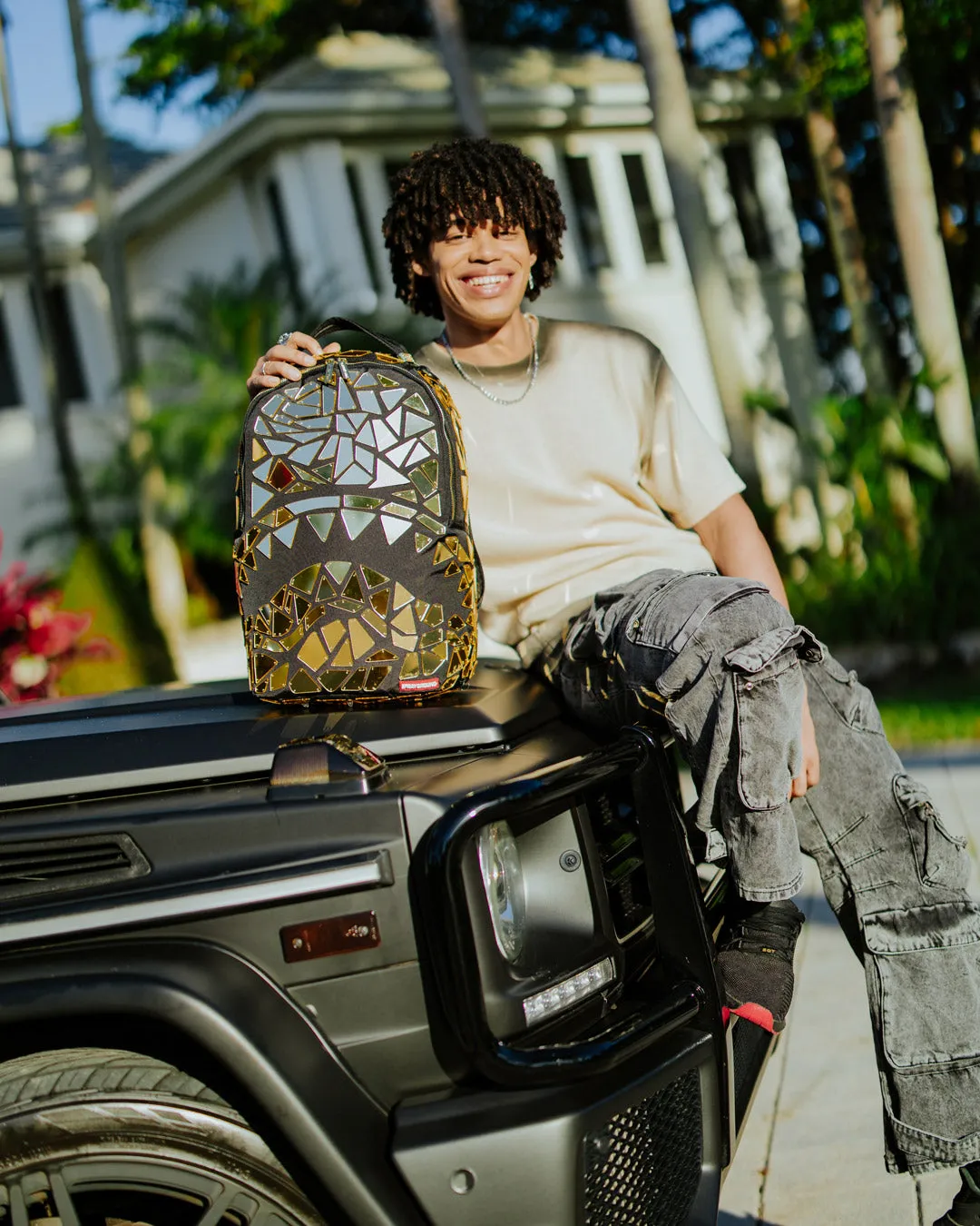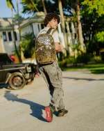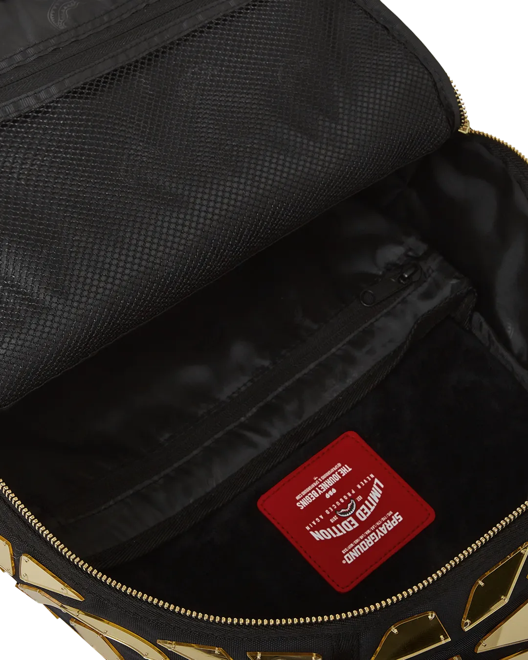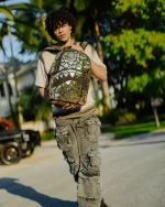 Dimensions: 18″ x 6″ x 11.5″ ? Front zipper pocket ? Side pockets ? Zippered Stash pocket ? Separate velour sunglass compartment ? Ergonomic mesh back padding ? Adjustable Straps for custom sizing ? Gold zippers with metal hardware ? Metal “Sprayground Authentic” badge ? Slide through back sleeve connects to carry-on luggage to free your hands