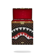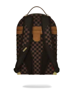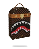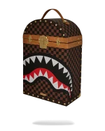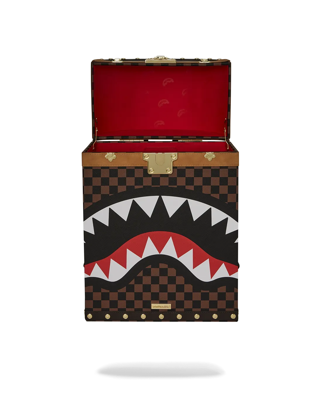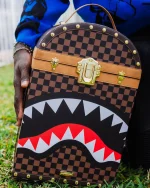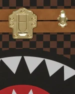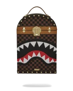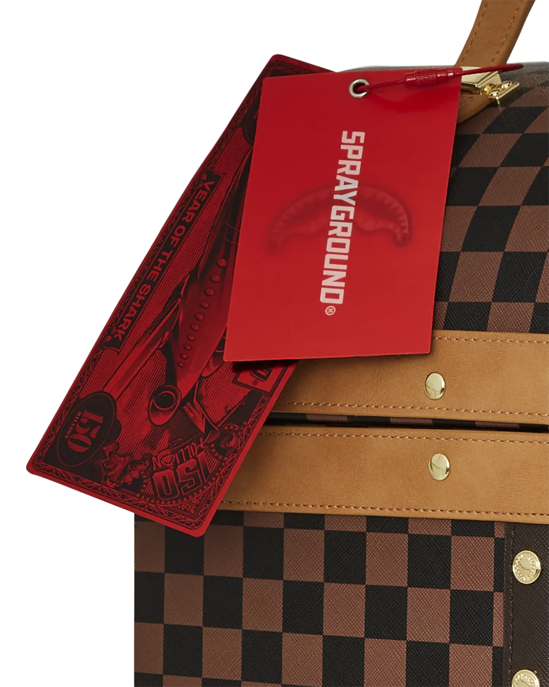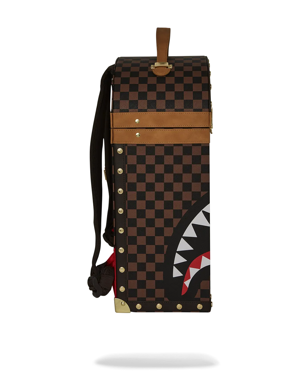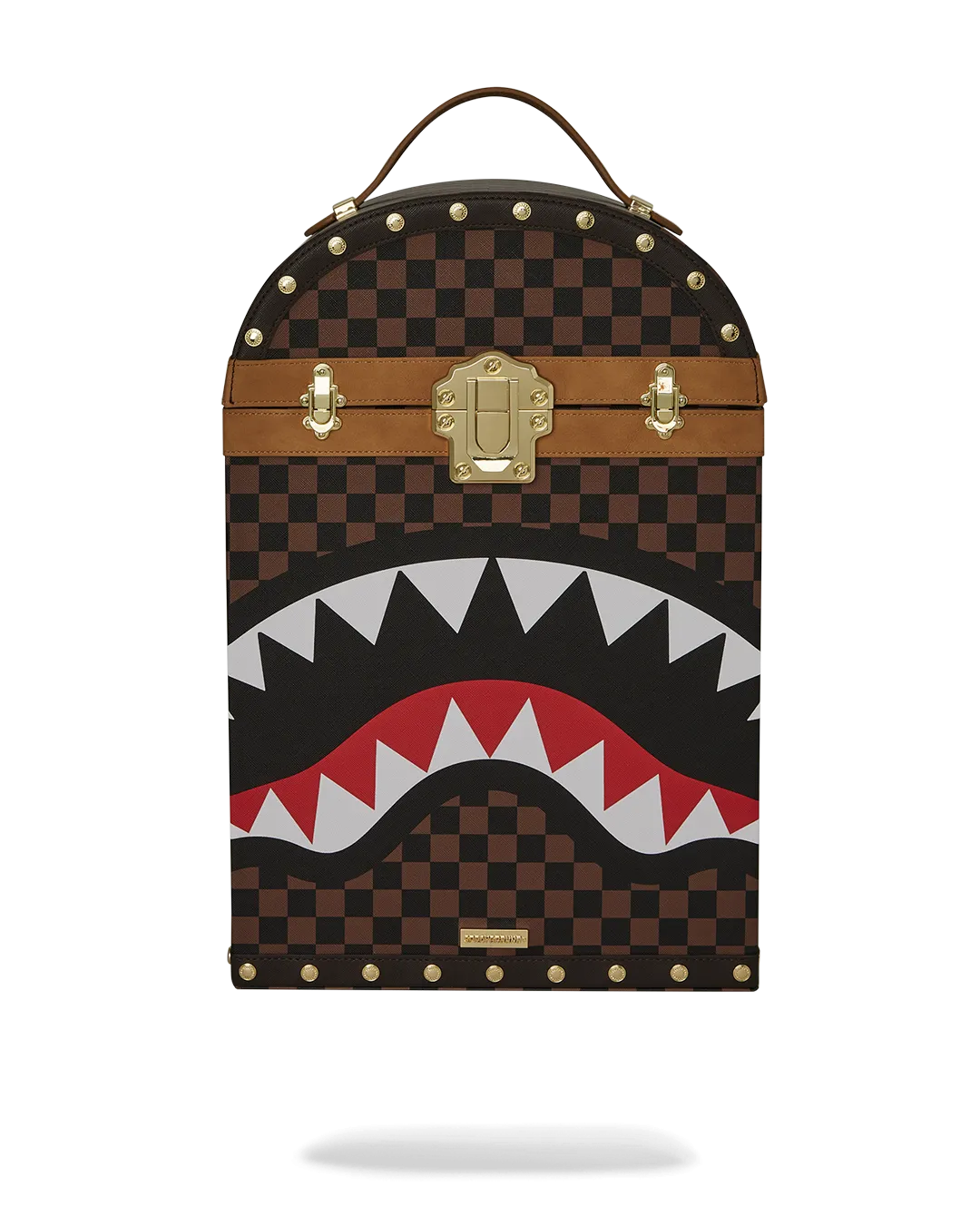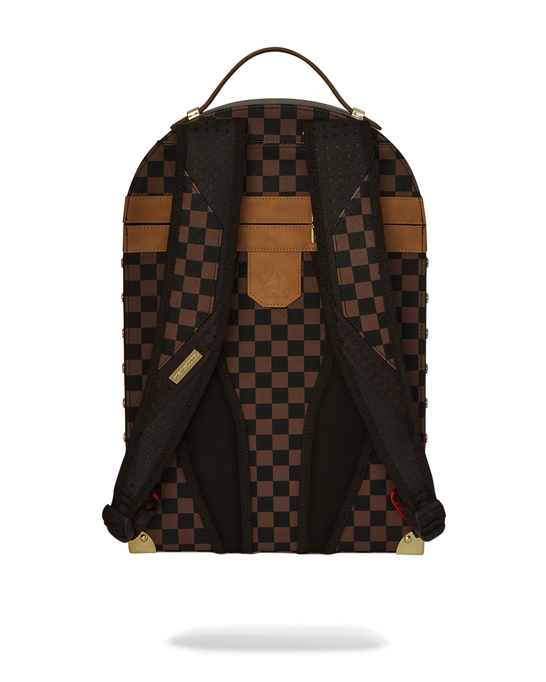Hard-shelled check PVC-lined trunk backpack. PVC leather applique detailing with embossed metal flat studs. PVC leather handle. Brass hardware including a brass lock. Three inner pockets for storage.?