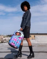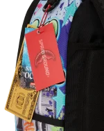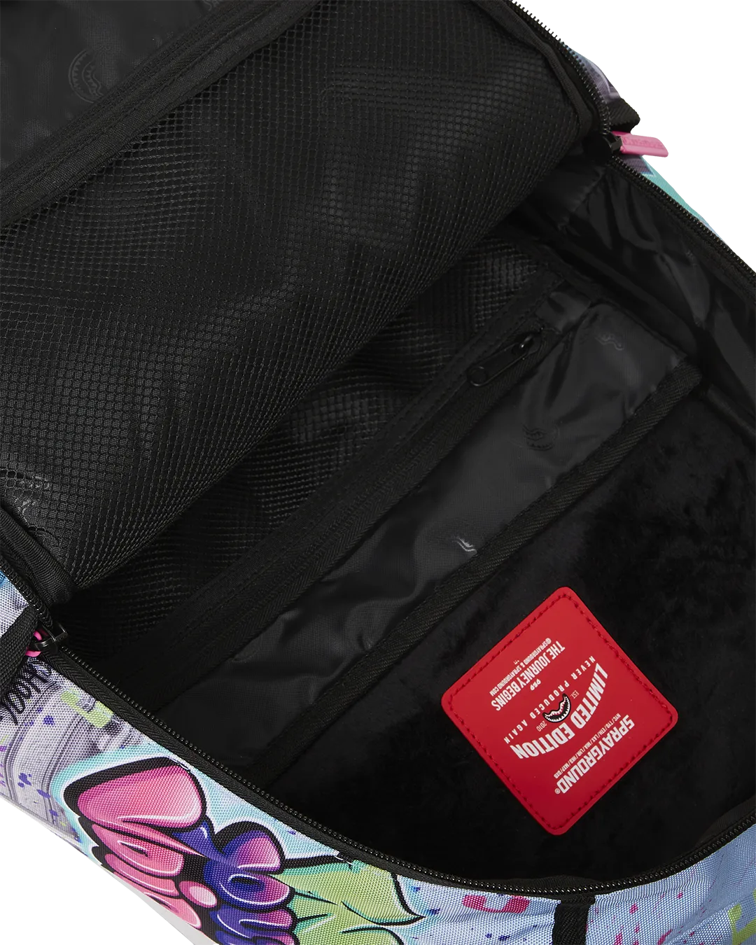 Dimensions: 18″ x 6″ x 11.5″ ? Front zipper pocket ? Side pockets ? Zippered Stash pocket ? Separate velour sunglass compartment ? Ergonomic mesh back padding ? Adjustable Straps for custom sizing ? Gold zippers with metal hardware ? Metal “Sprayground Authentic” badge ? Slide through back sleeve connects to carry-on luggage to free your hands