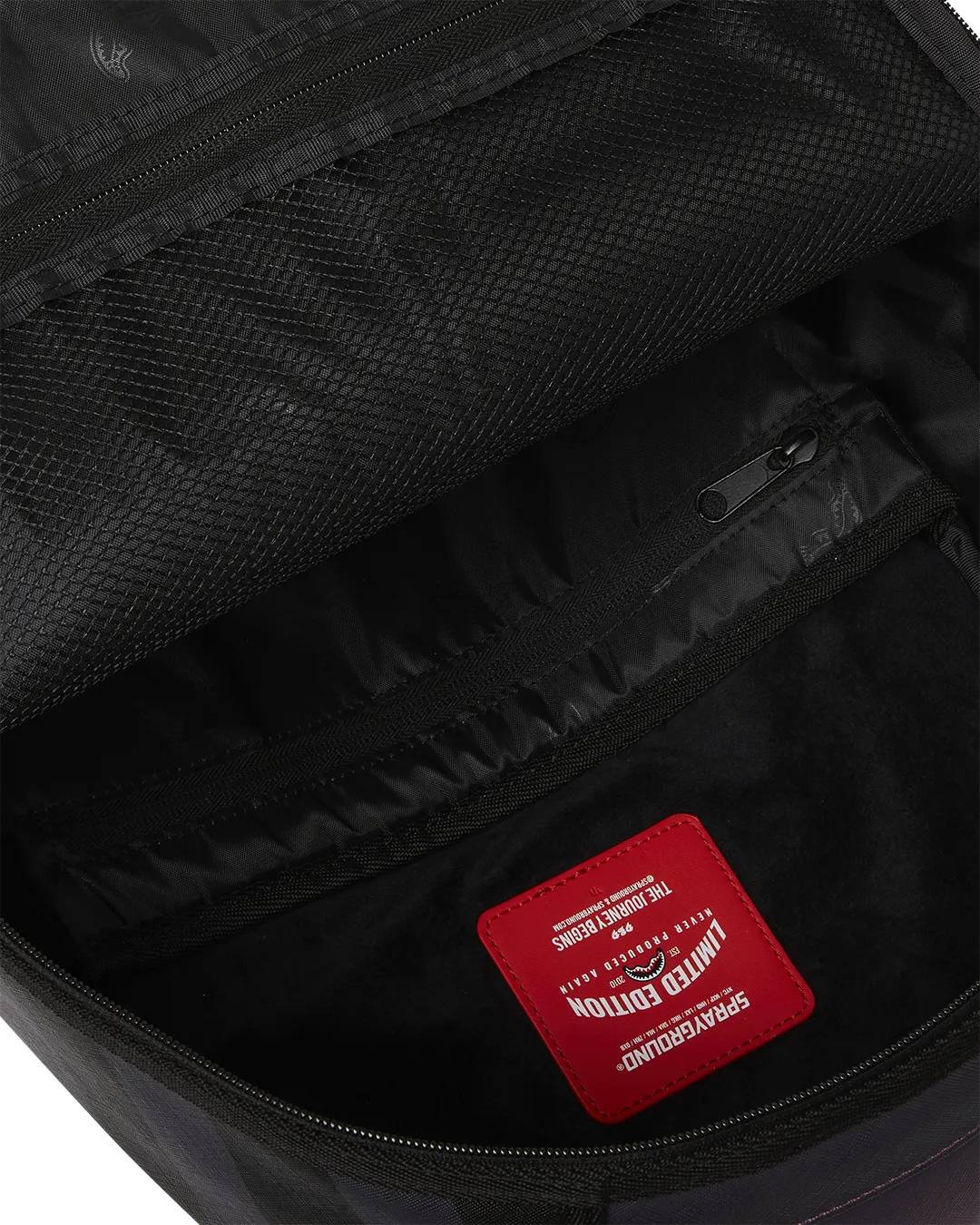 Dimensions: 18″ x 6″ x 11.5″ ? Front zipper pocket ? Side pockets ? Zippered Stash pocket ? Separate velour sunglass compartment ? Ergonomic mesh back padding ? Adjustable Straps for custom sizing ? Gold zippers with metal hardware ? Metal “Sprayground Authentic” badge ? Slide through back sleeve connects to carry-on luggage to free your hands