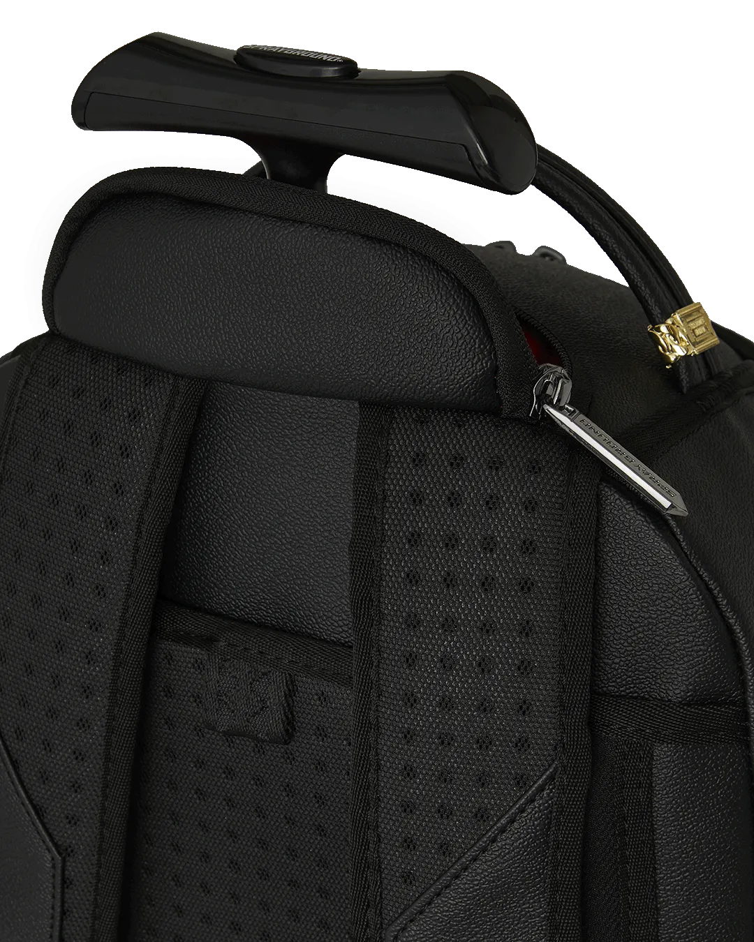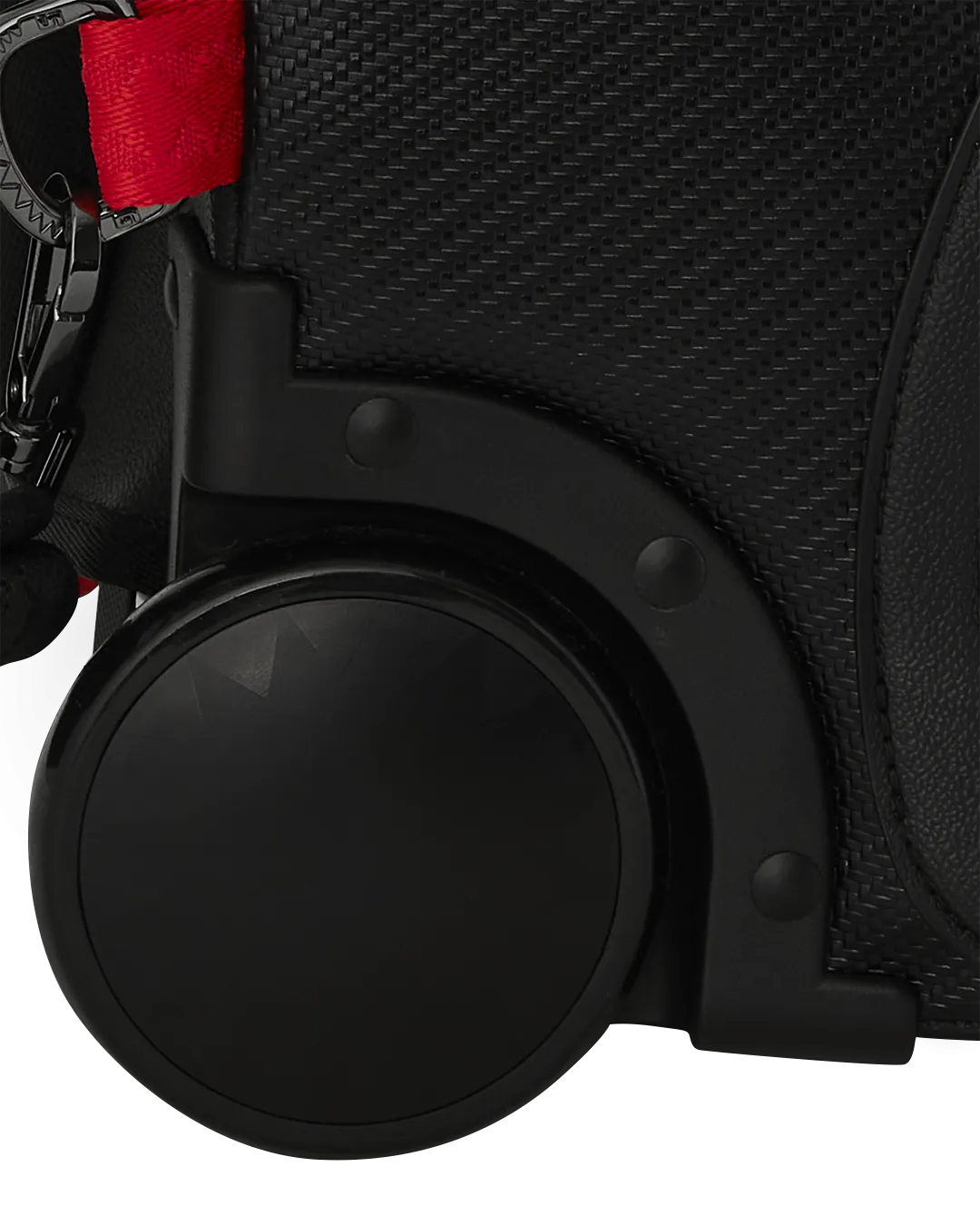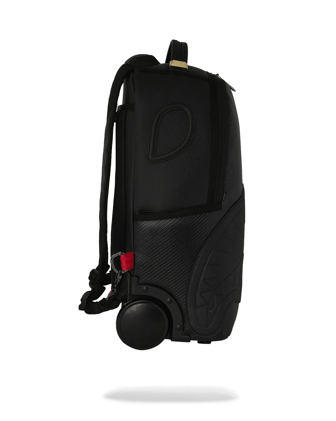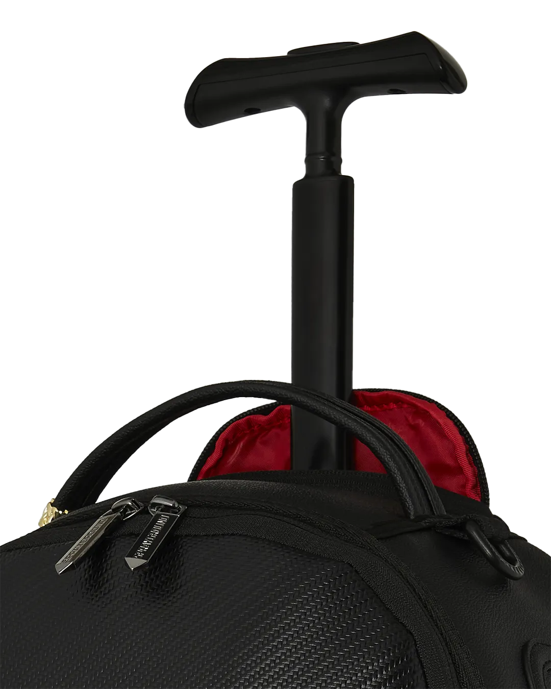 Faux carbon fiber DLX with PVC grain embossed sharmouth, wheels for traveling, bottom of straps can be unhooked to keep clean while rolling, easy zippered compartment for handle storage, suitcase handle sleeve, padded laptop compartment, interior mesh zipper, flat base, embossed zipper pulls, whip stitch luggage tag