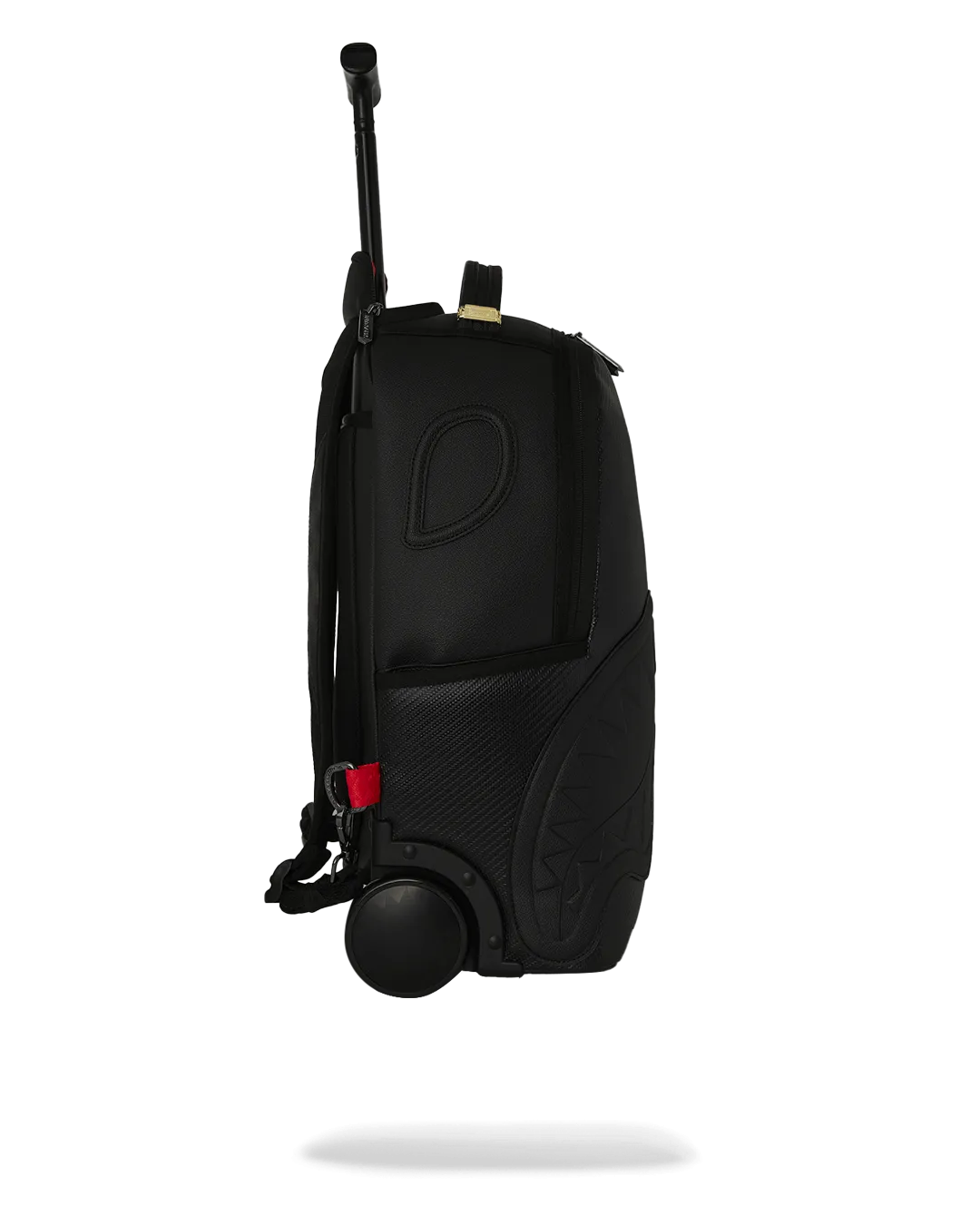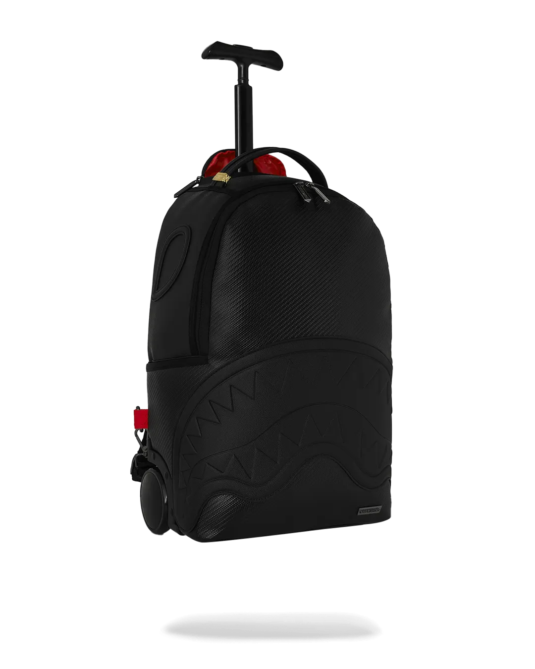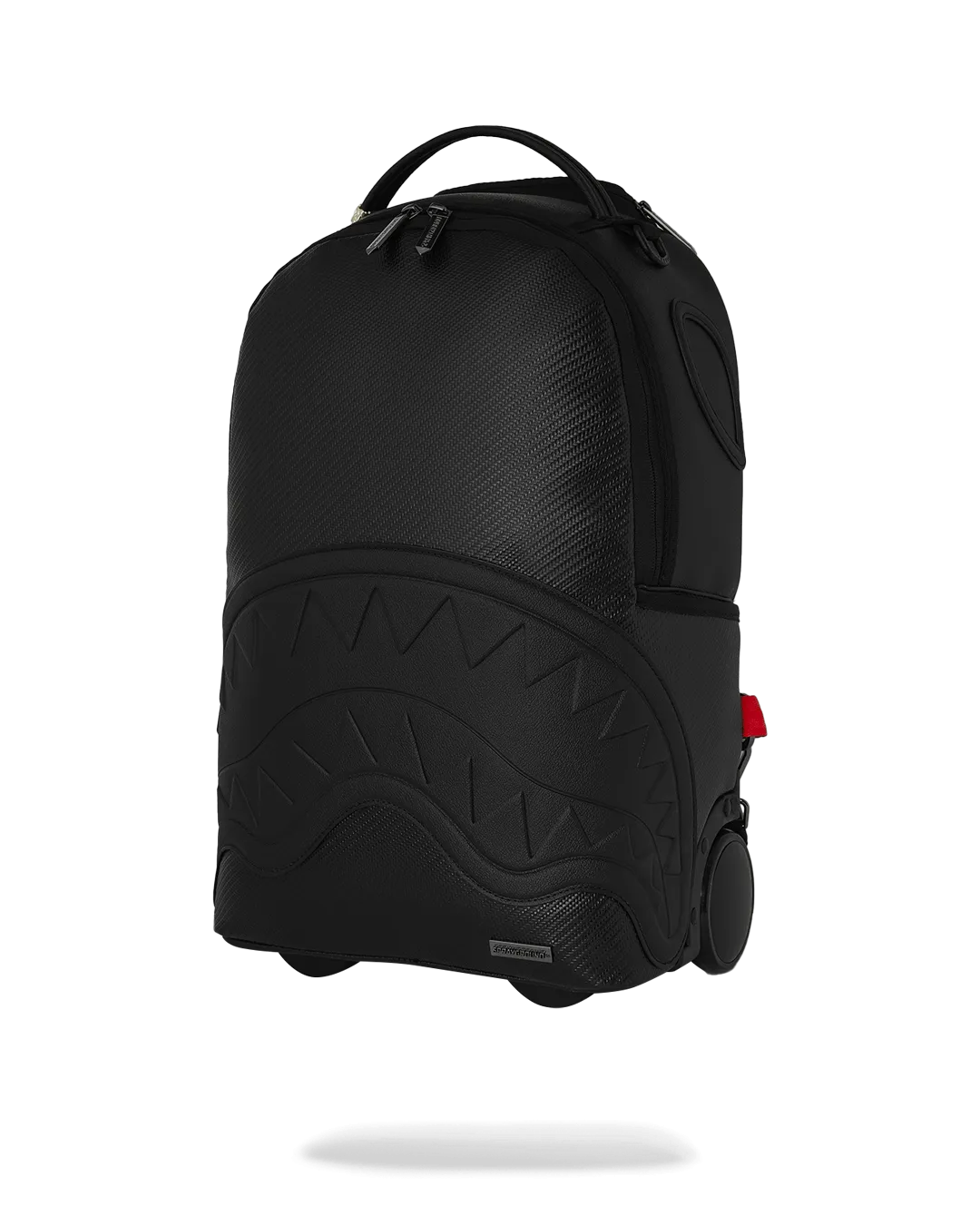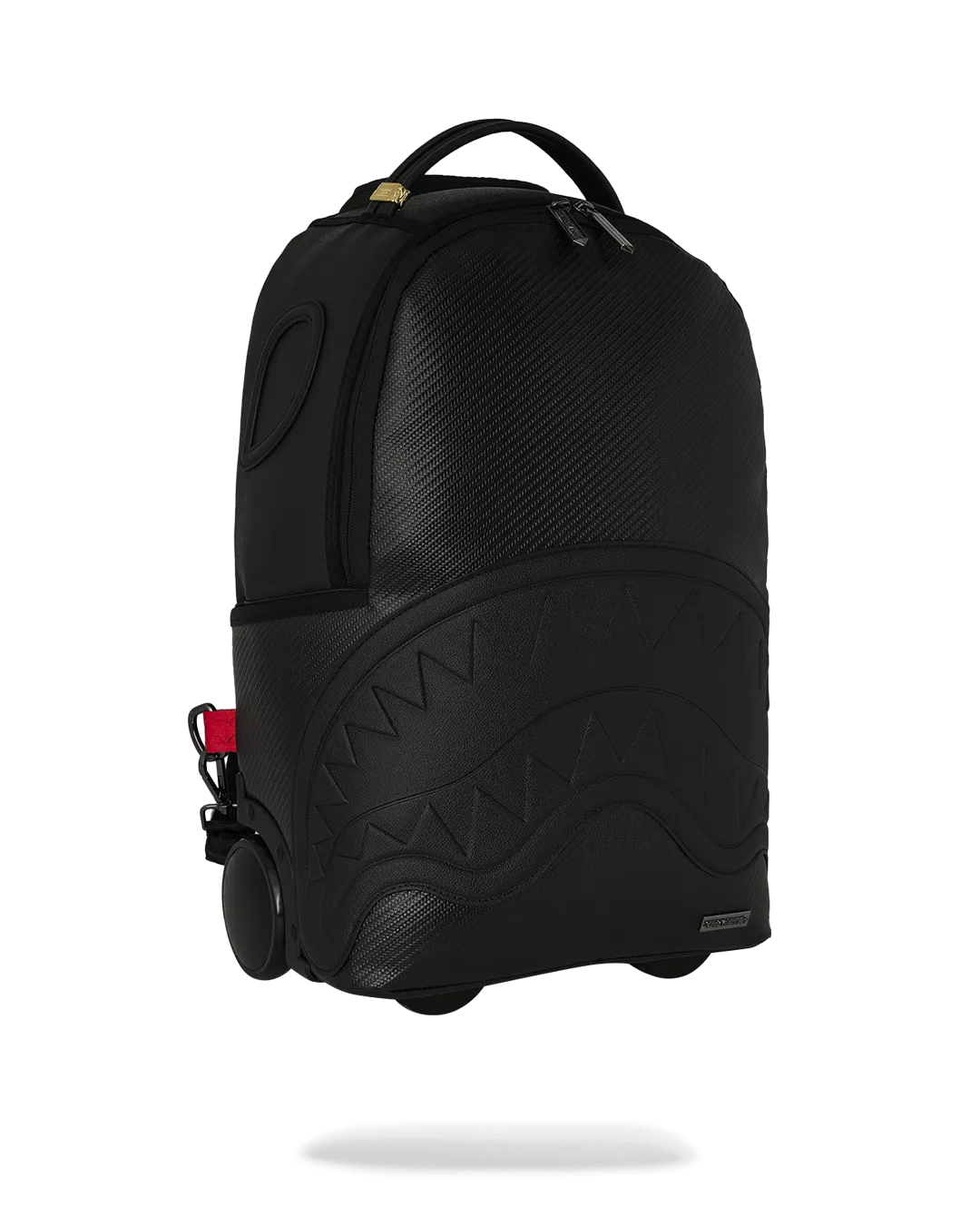 Faux carbon fiber DLX with PVC grain embossed sharmouth, wheels for traveling, bottom of straps can be unhooked to keep clean while rolling, easy zippered compartment for handle storage, suitcase handle sleeve, padded laptop compartment, interior mesh zipper, flat base, embossed zipper pulls, whip stitch luggage tag