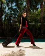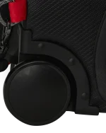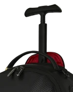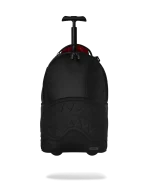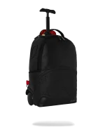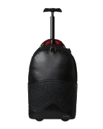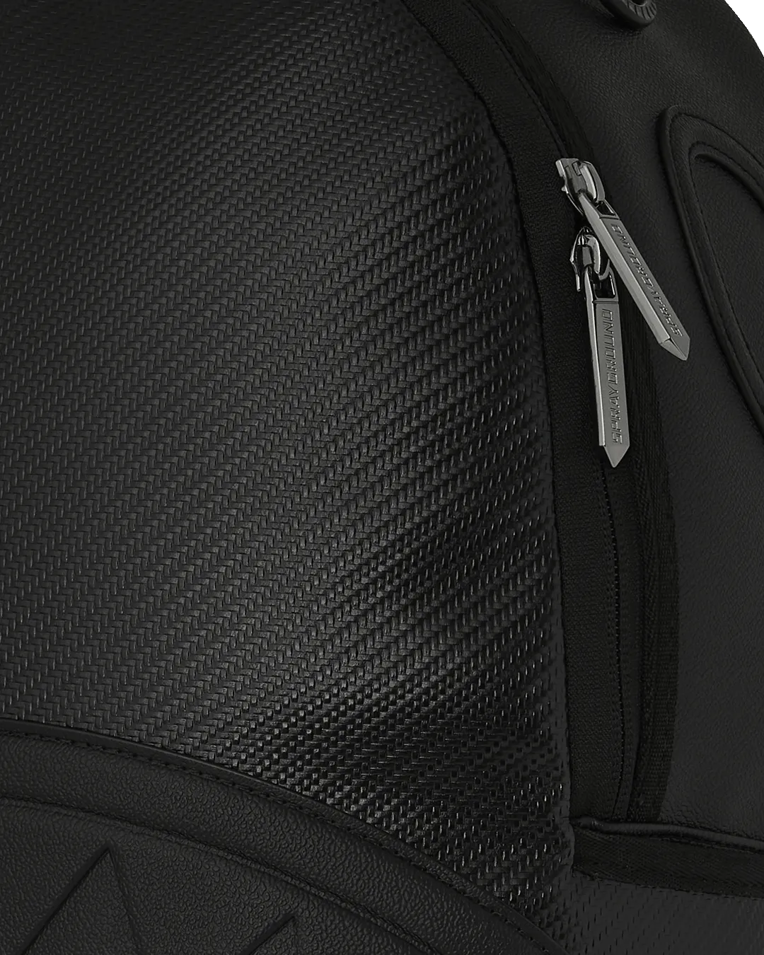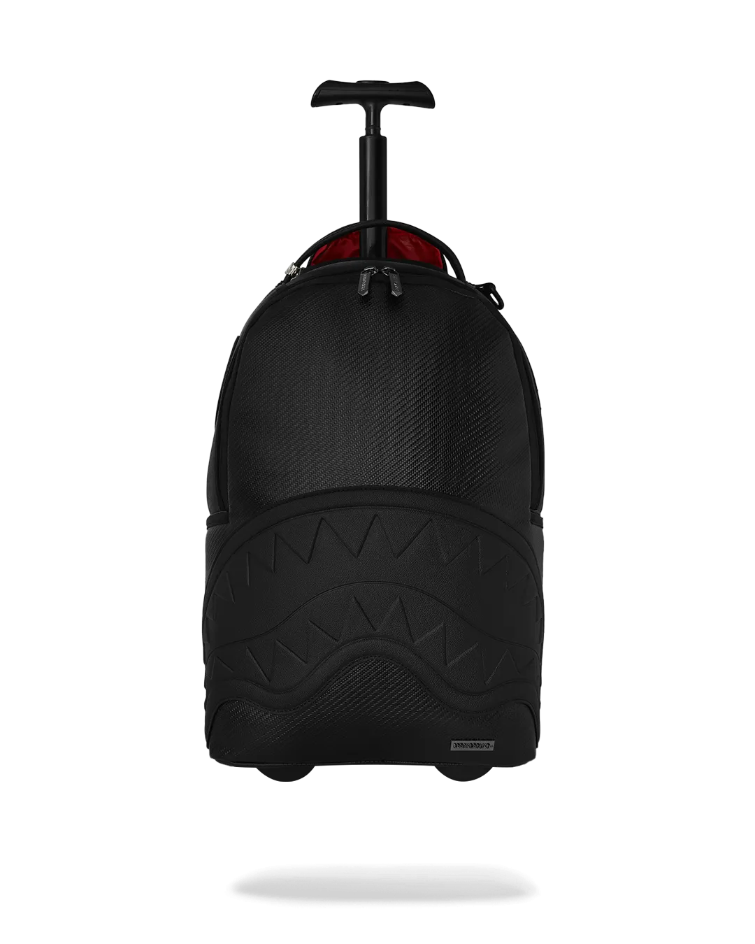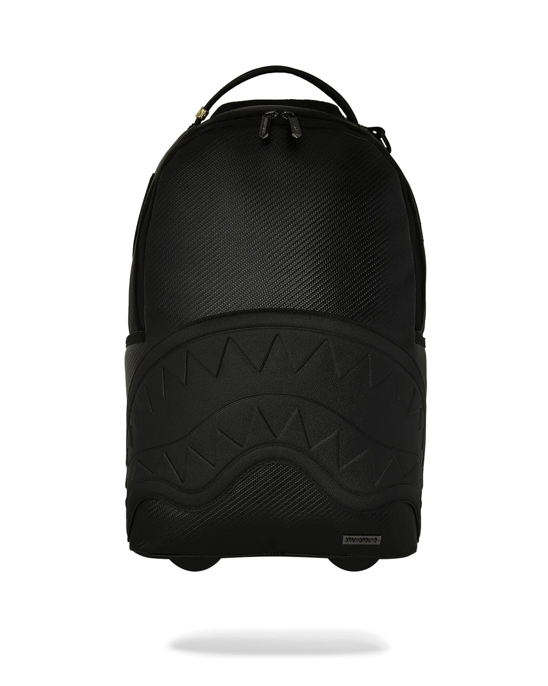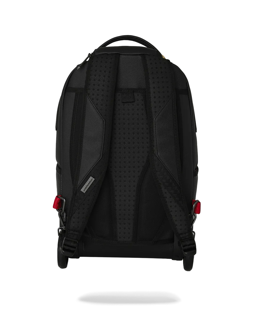 Faux carbon fiber DLX with PVC grain embossed sharmouth, wheels for traveling, bottom of straps can be unhooked to keep clean while rolling, easy zippered compartment for handle storage, suitcase handle sleeve, padded laptop compartment, interior mesh zipper, flat base, embossed zipper pulls, whip stitch luggage tag