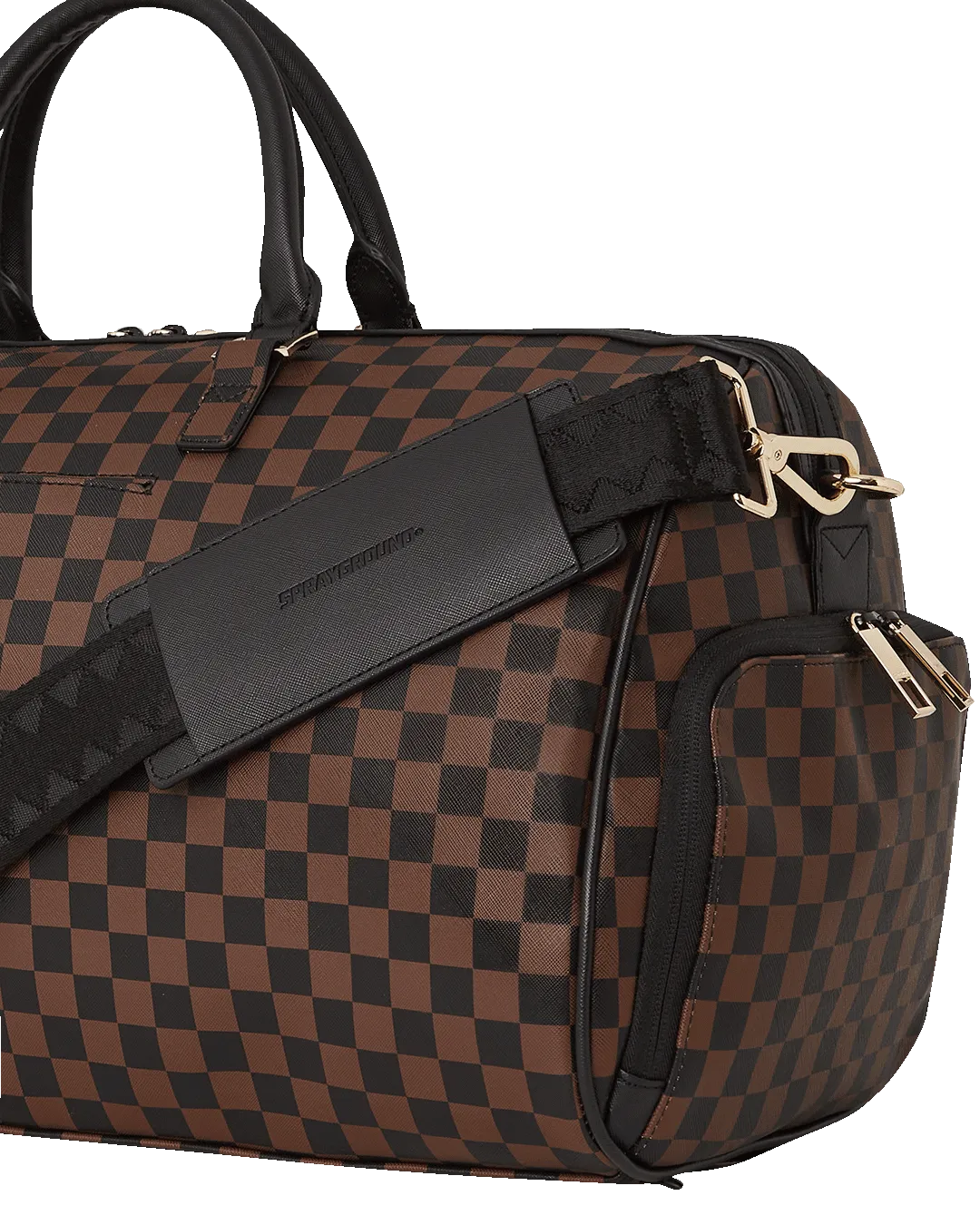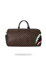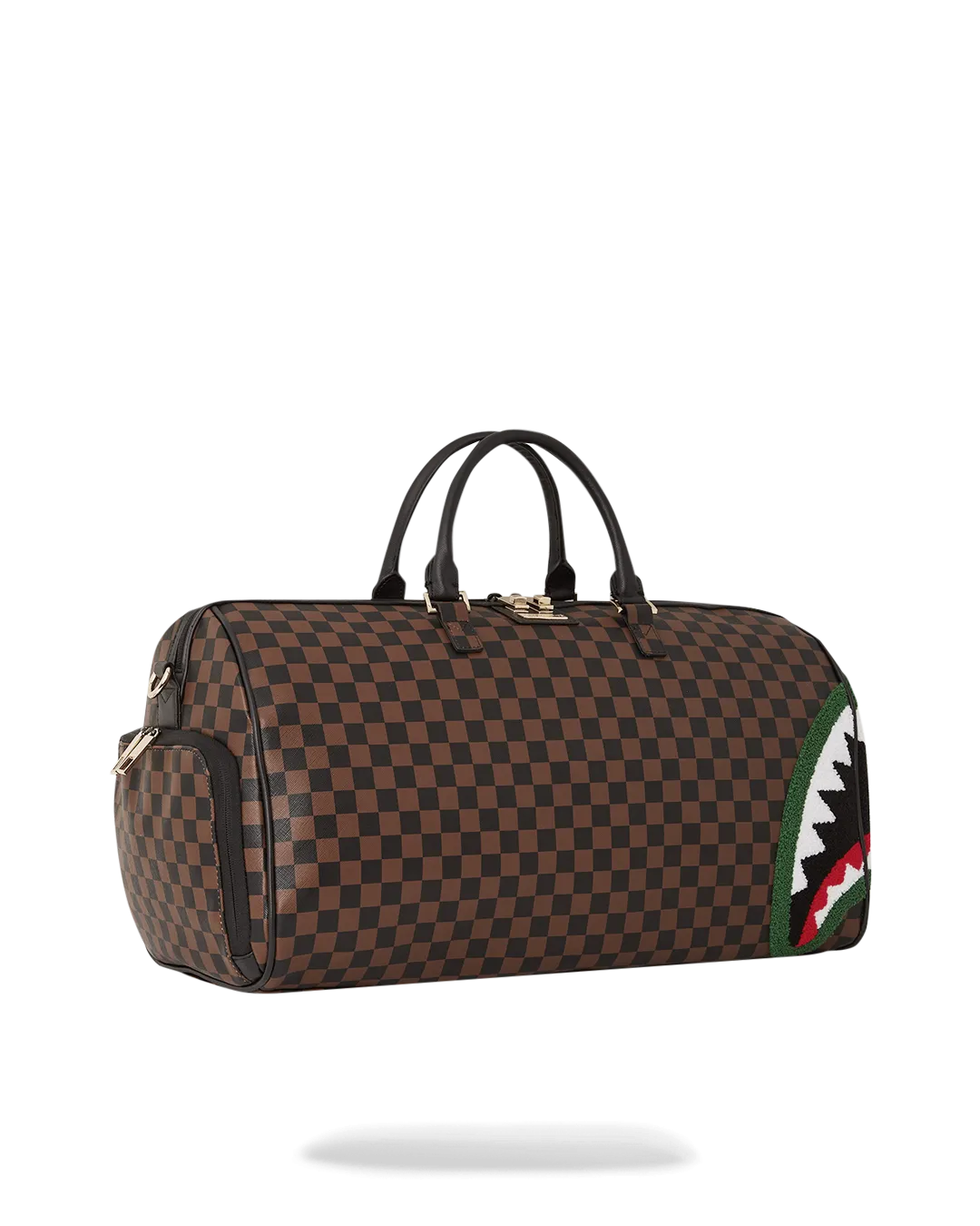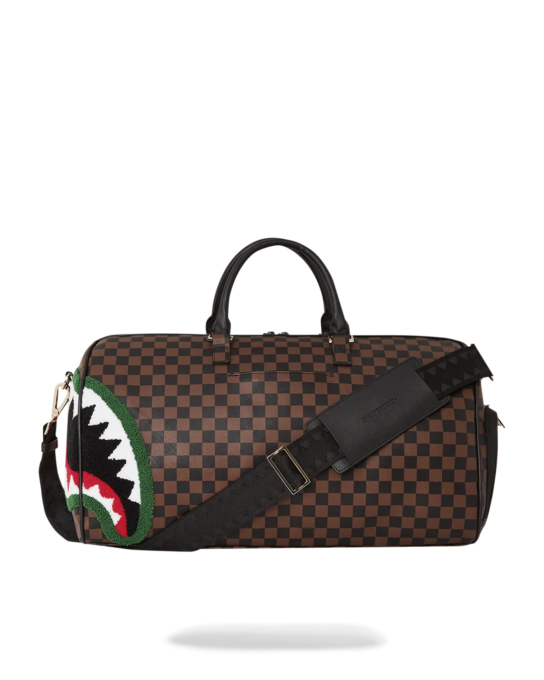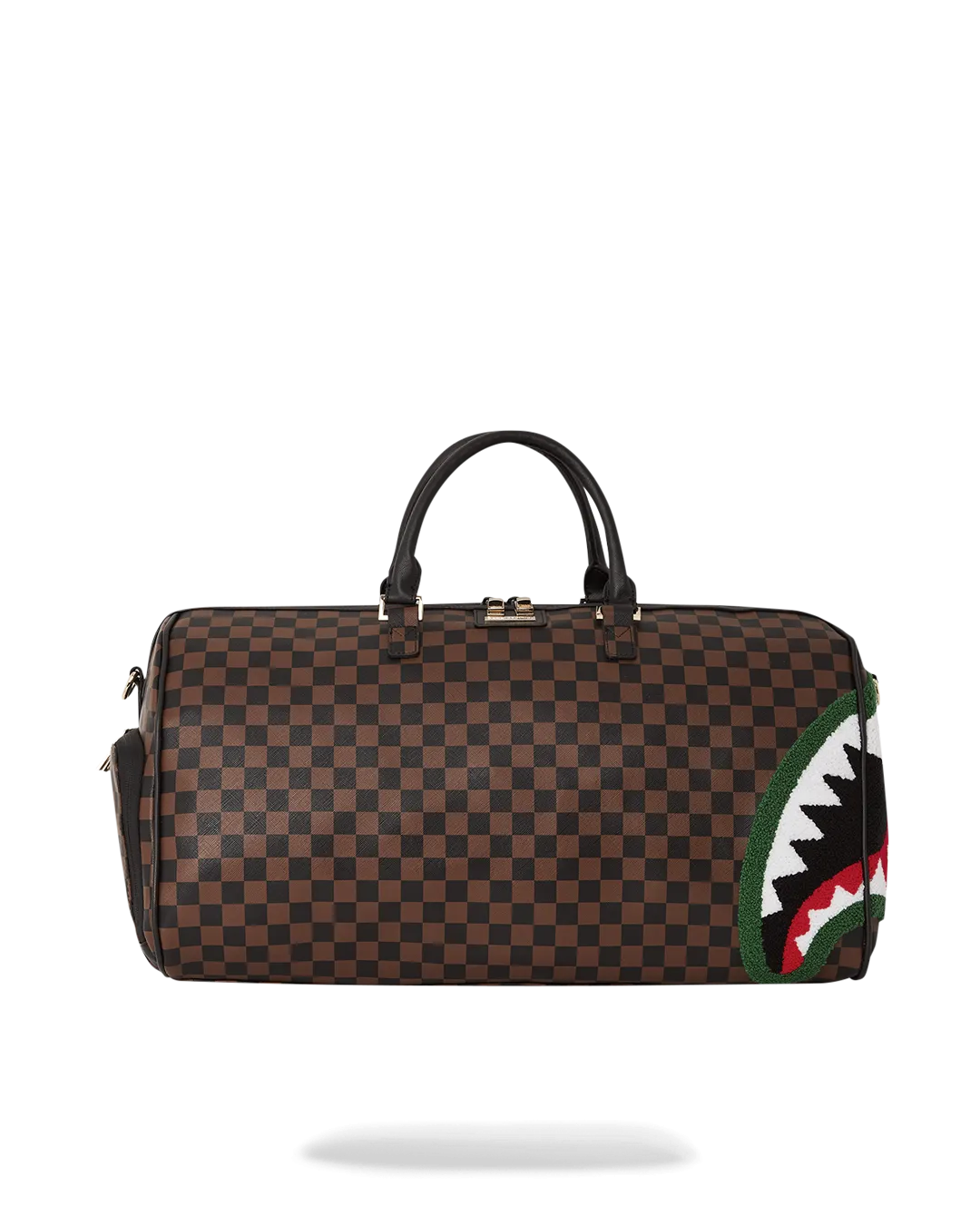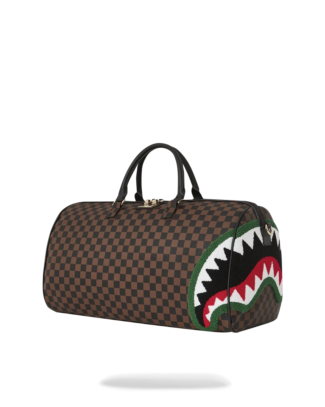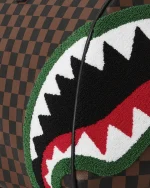 100% PVC Sharks in Paris check pattern on PVC material with textured chenille shark mouth on top featuring gold hardware