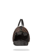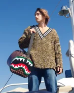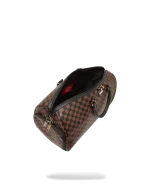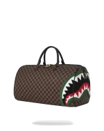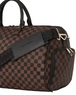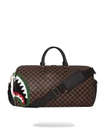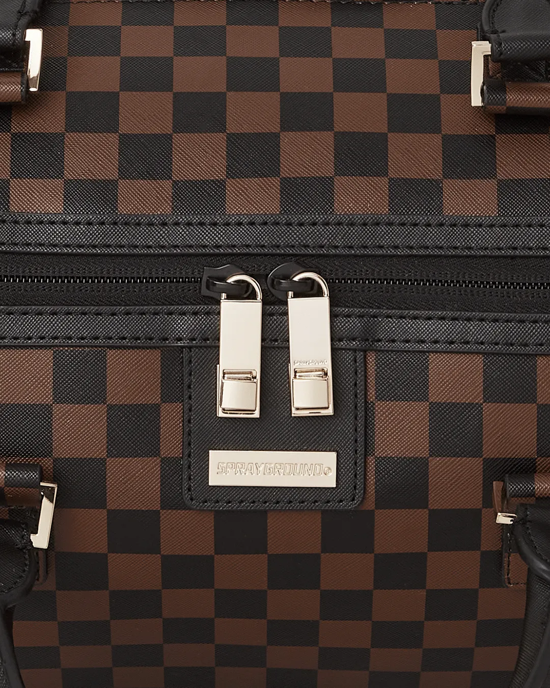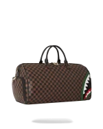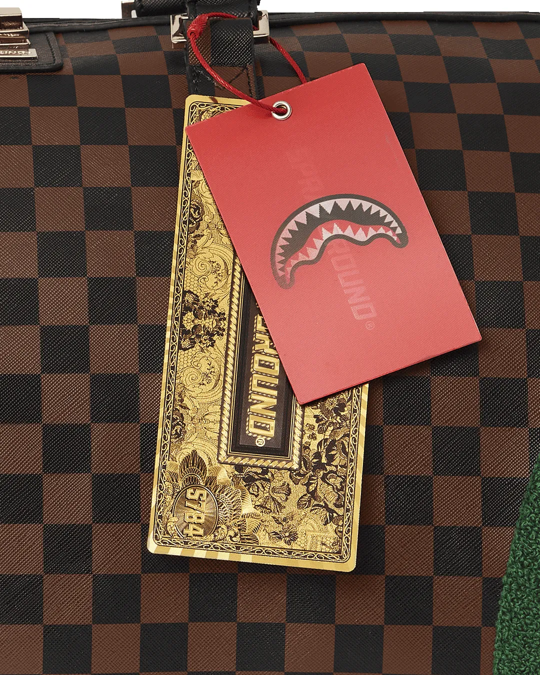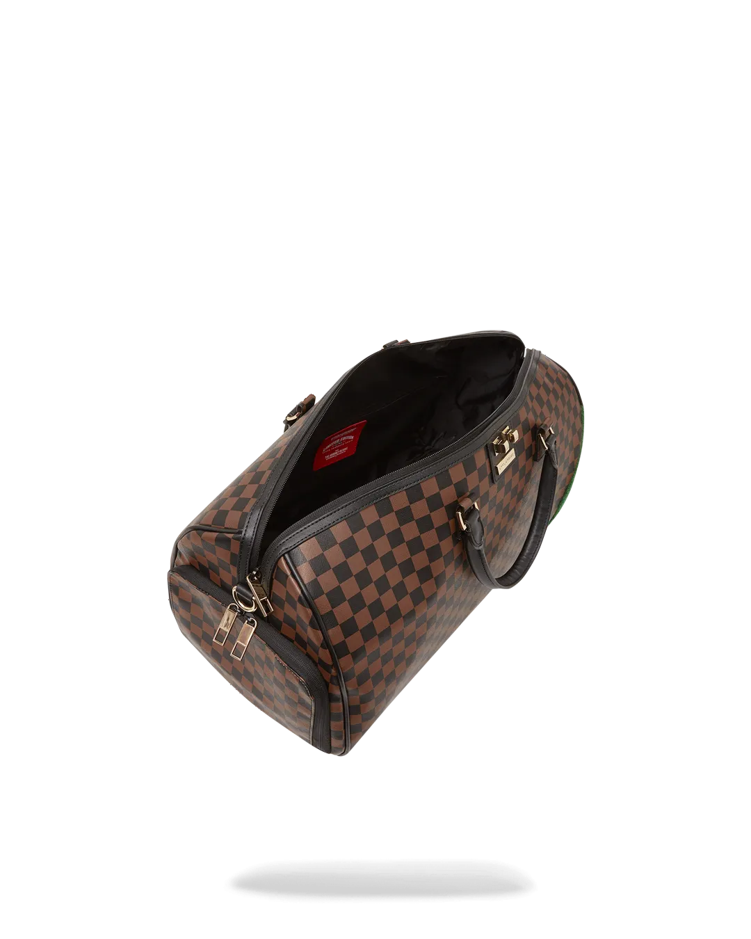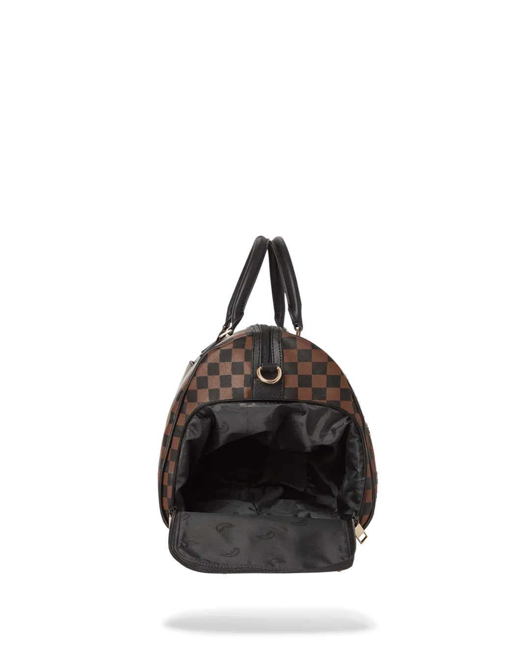 100% PVC Sharks in Paris check pattern on PVC material with textured chenille shark mouth on top featuring gold hardware