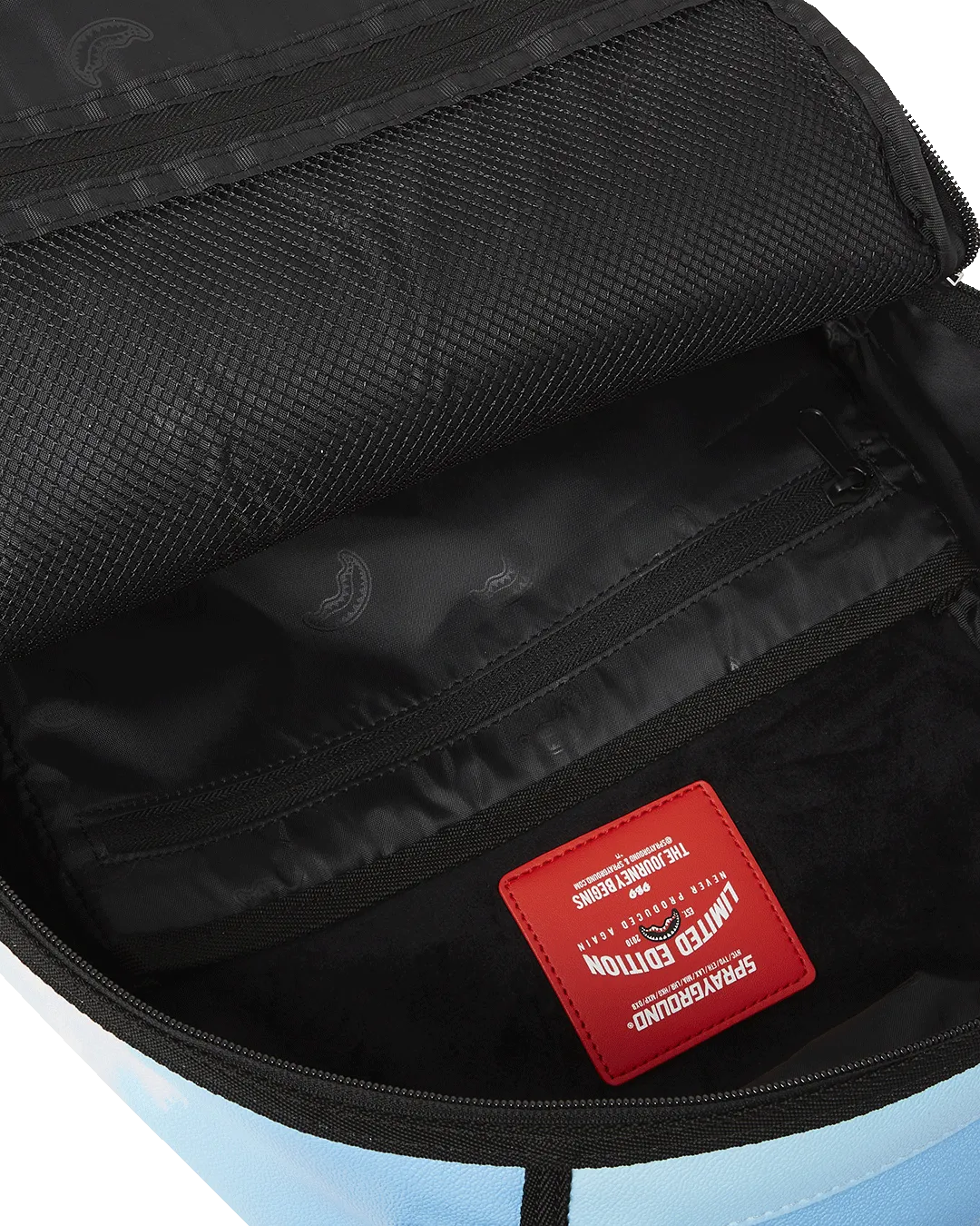 Dimensions: 18″ x 6″ x 11.5″ ? Front zipper pocket ? Side pockets ? Zippered Stash pocket ? Separate velour sunglass compartment ? Ergonomic mesh back padding ? Adjustable Straps for custom sizing ? Gold zippers with metal hardware ? Metal “Sprayground Authentic” badge ? Slide through back sleeve connects to carry-on luggage to free your hands