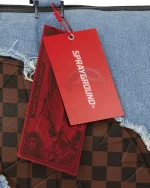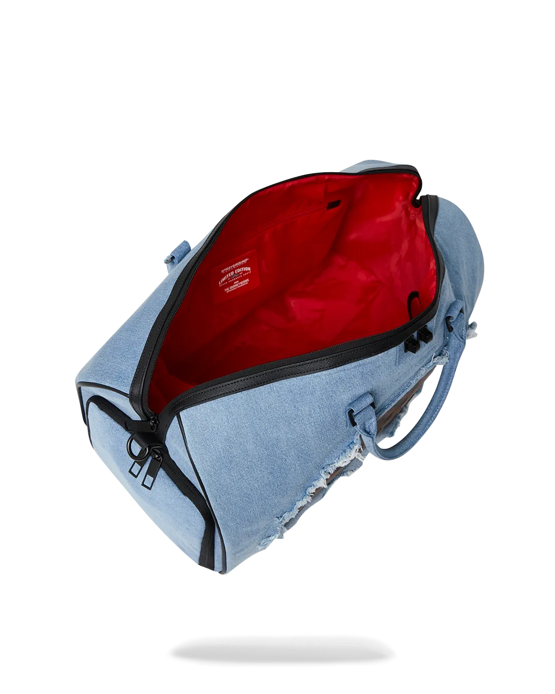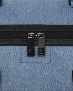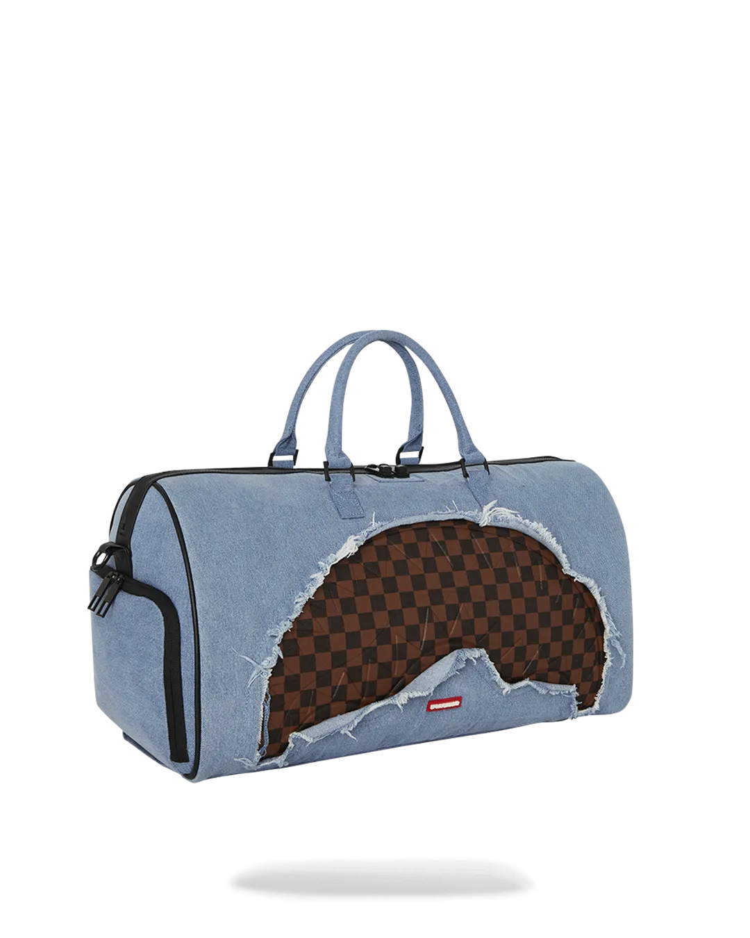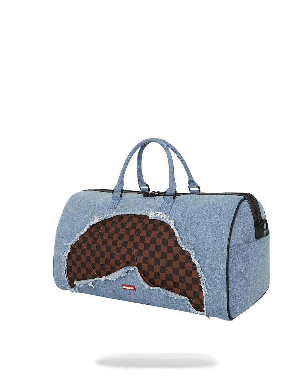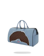 100% cotton denim bag with embossed details such as the sharkmouth and zipper pullers. Sewn faux leather details around the front zipper pocket.