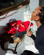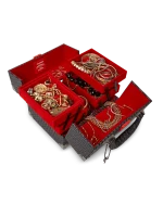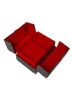Red velour lining, Tiered shelving, removable tray, ?interior mirror.