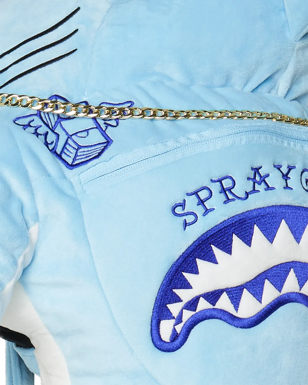 Features a cut and sew drippy sharkmouth