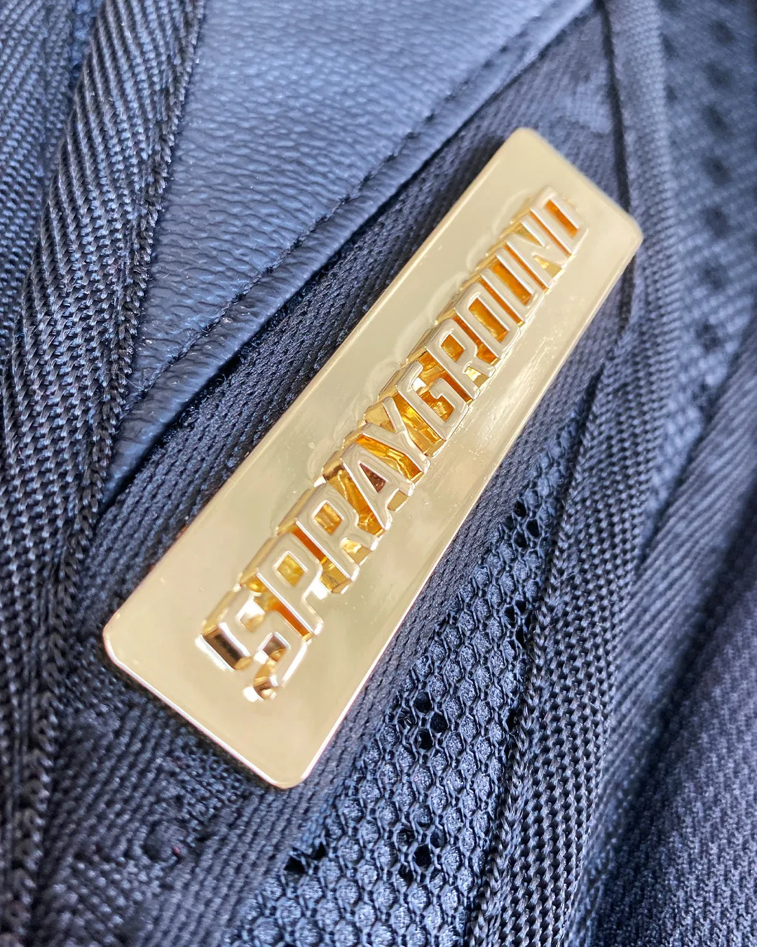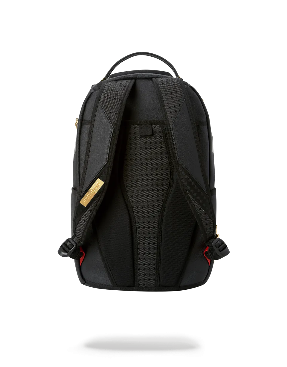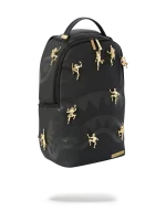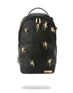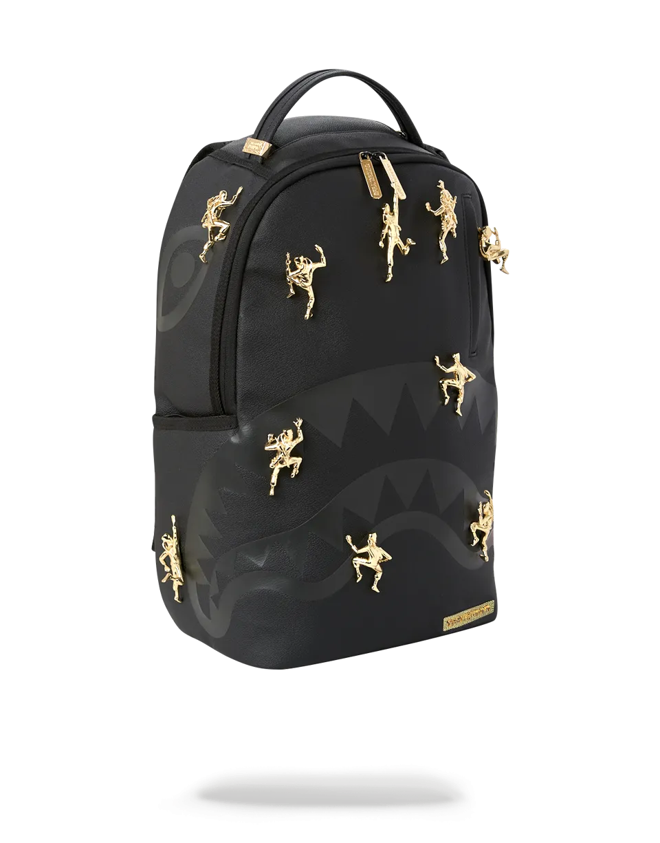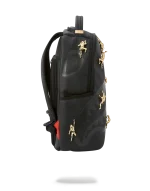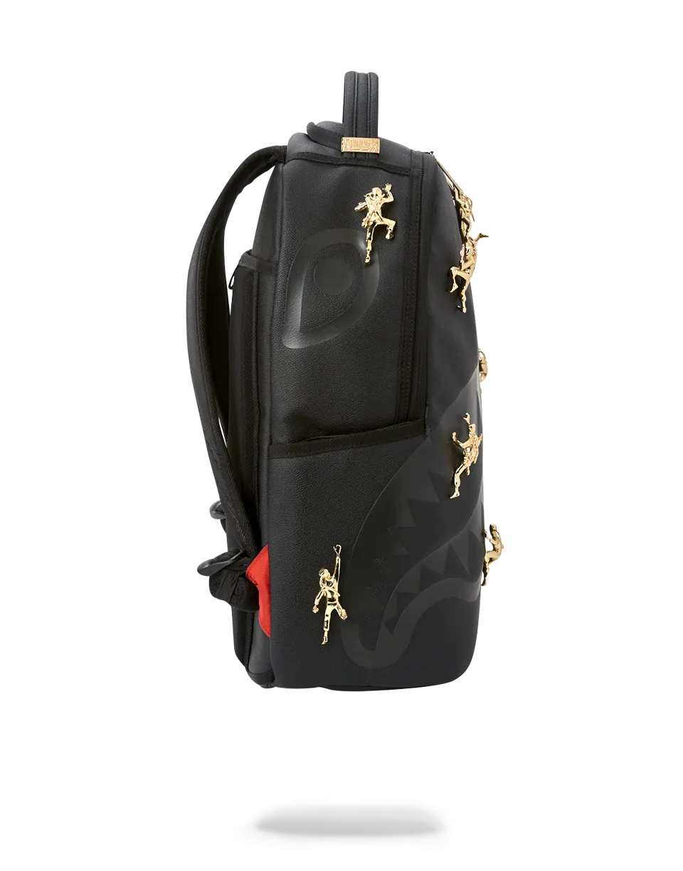 11 Die-Case Gold Metal 3D Ninja’s Permanently Attached to the Backpack. Vegan Leather w/ Black Shark Bag. Dimensions: 18″ x 6″ x 11.5″ ? Gold ninjas and zippers with Gold metal hardware???Front zipper pocket ? Side pockets ? Zippered Stash pocket ? Separate velour sunglass compartment ? Ergonomic mesh back padding ? Adjustable Straps for custom sizing ? Metal “Sprayground Authentic” badge ? Slide through back sleeve connects to carry-on luggage to free your hands