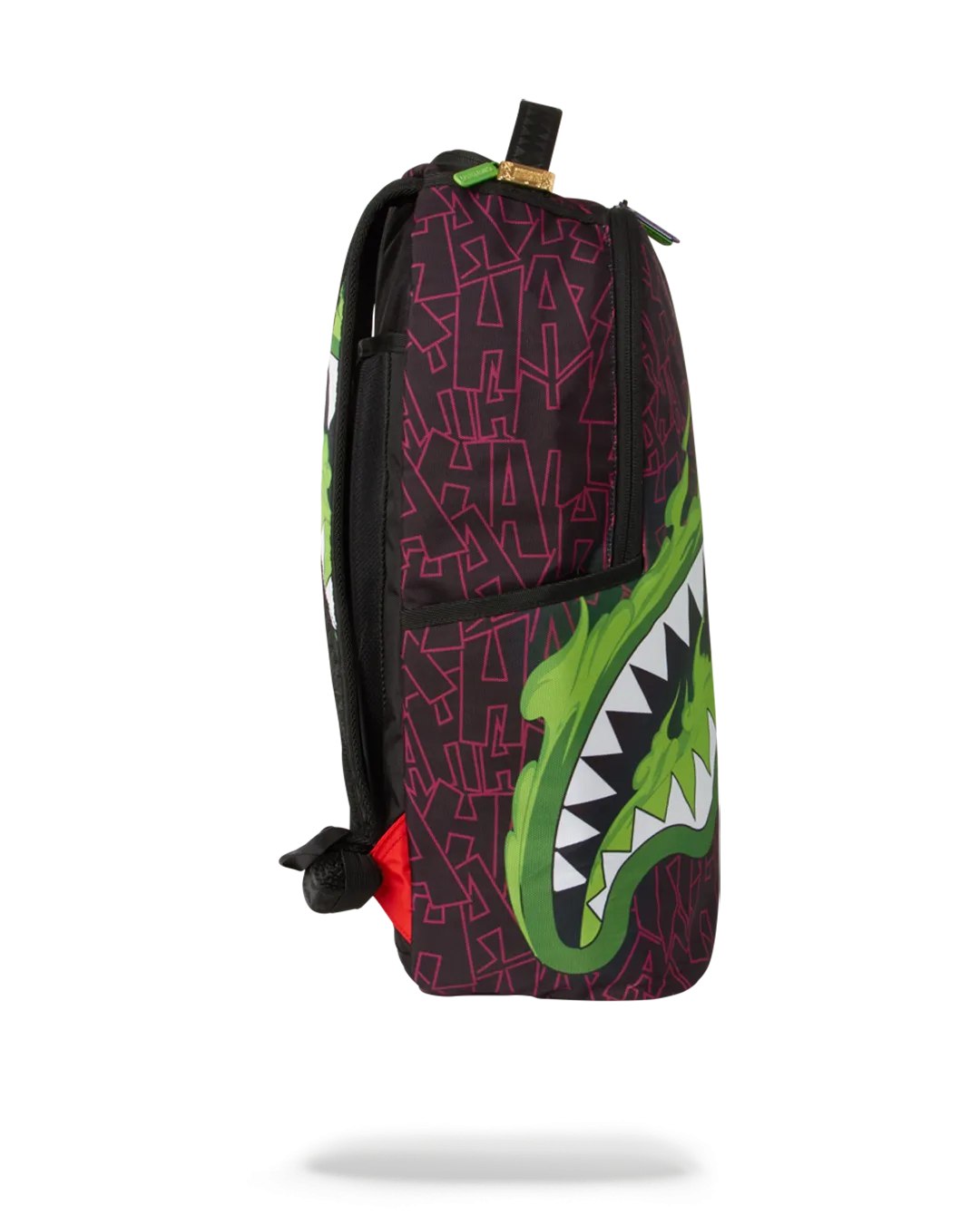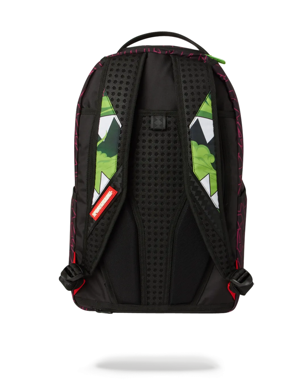 Dimensions: 18″ x 6″ x 11.5″ ? Front zipper pocket ? Side pockets ? Zippered Stash pocket ? Separate velour sunglass compartment ? Ergonomic mesh back padding ? Adjustable Straps for custom sizing ? Green and purple zippers with metal hardware ? Metal “Sprayground Authentic” badge ? Slide through back sleeve connects to carry-on luggage to free your hands