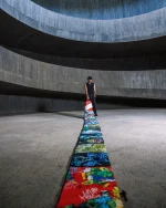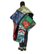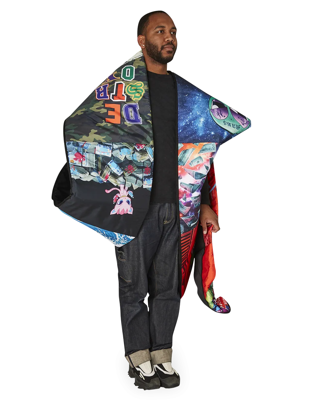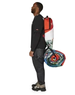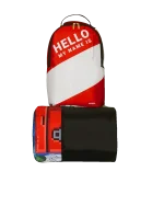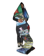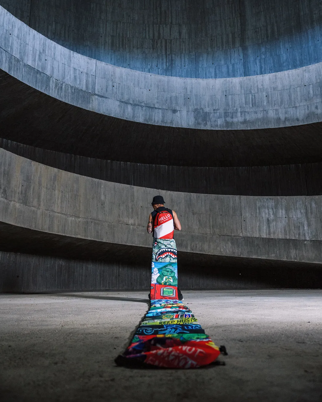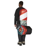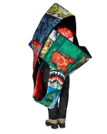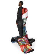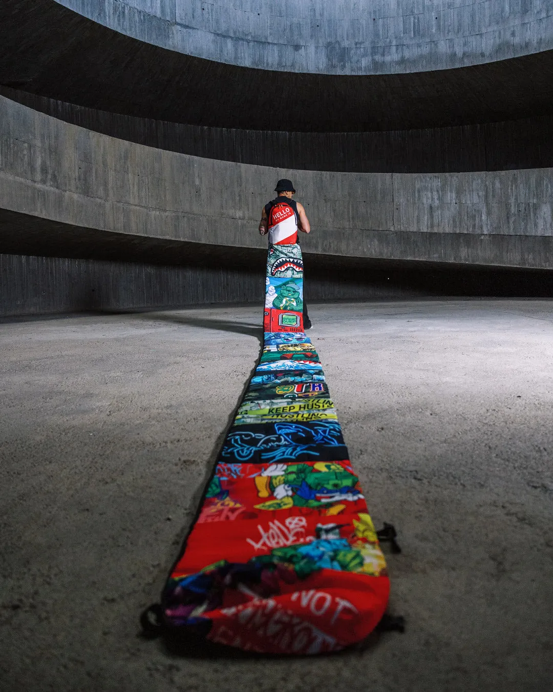 One of a kind backpack for our 15 year anniversary, featuring a train of 15 different art designs. The top bag is fully functional. The train does not have any pockets it is purely for style. It is 22 ft. long, polyester, features a strap to fasten the train when rolled up, and exclusive 15 year backpack details.?