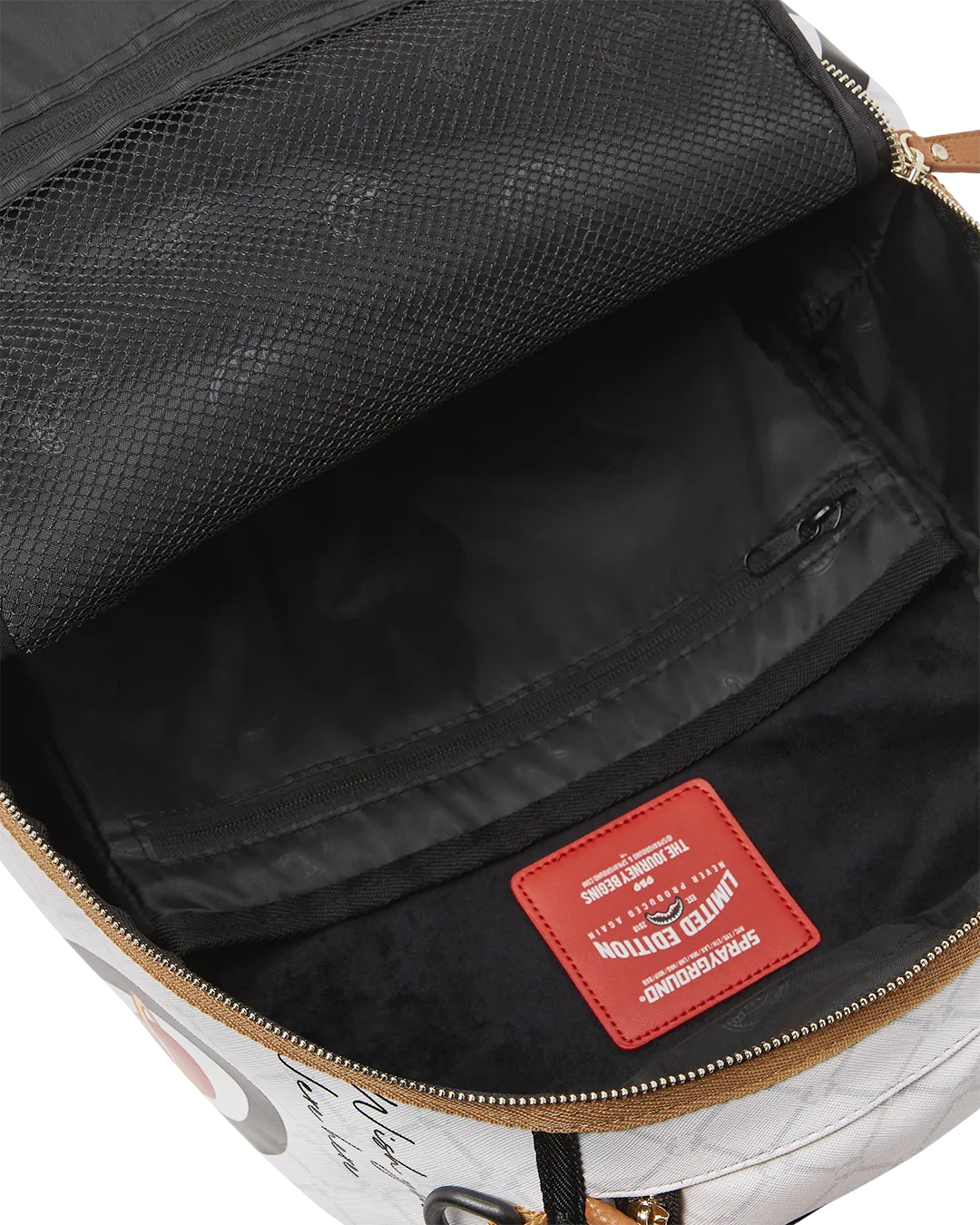 Dimensions: 18″ x 6″ x 11.5″ ? Front zipper pocket ? Side pockets ? Zippered Stash pocket ? Separate velour sunglass compartment ? Ergonomic mesh back padding ? Adjustable Straps for custom sizing ? Red zippers with metal hardware ? Metal “Sprayground Authentic” badge ? Slide through back sleeve connects to carry-on luggage to free your hands