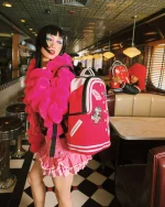 Heavyweight felted wool with PVC cut and sew detailing, embroidered patches, and faux buttons